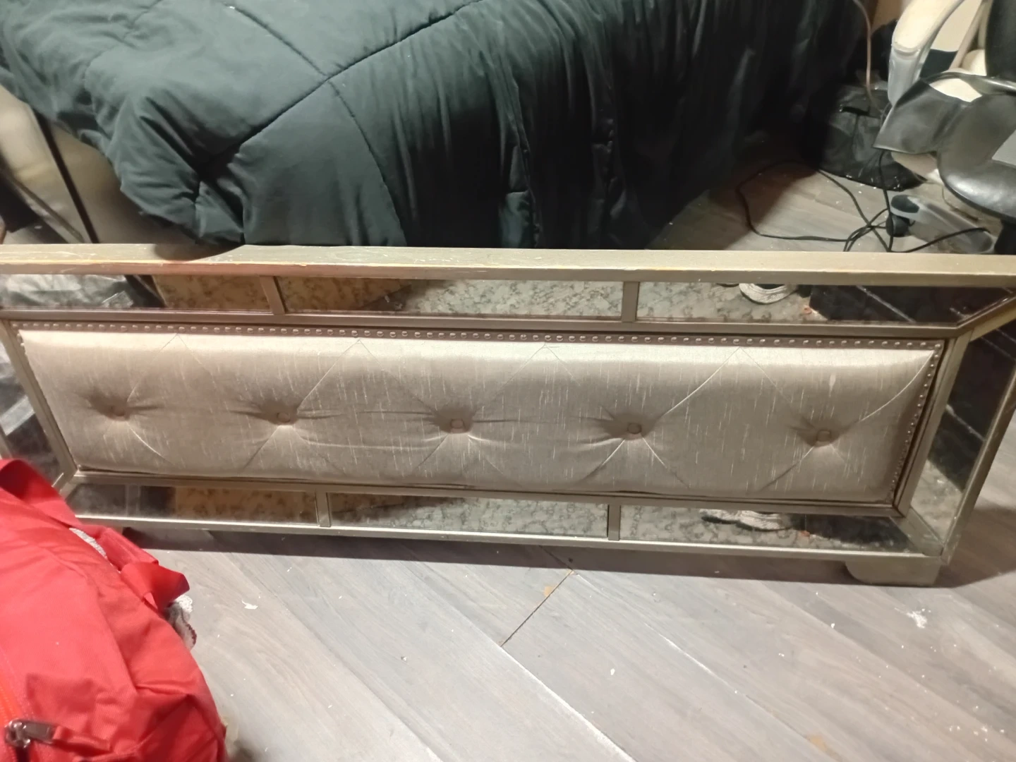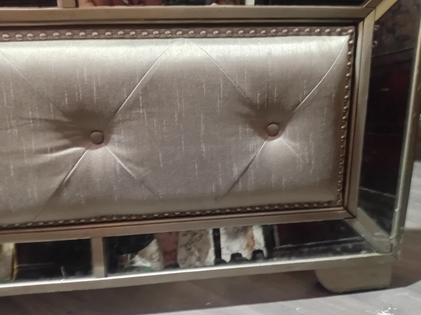 Selling a dresser with mirrored accents and an upholstered front. It's a nice piece for adding a touch of glamour to your bedroom or dressing area! The upholstery is in a neutral colour that should match most decor styles