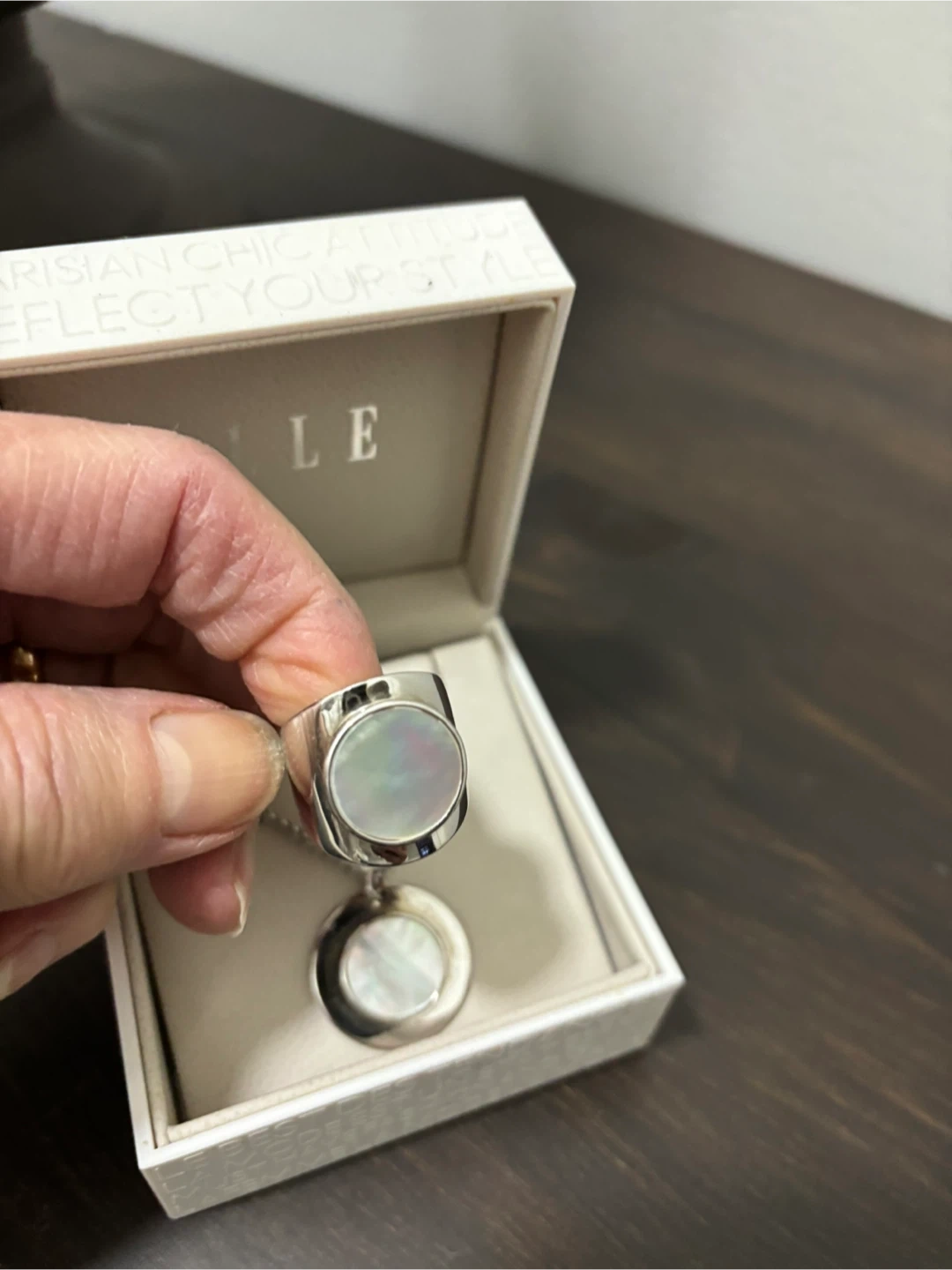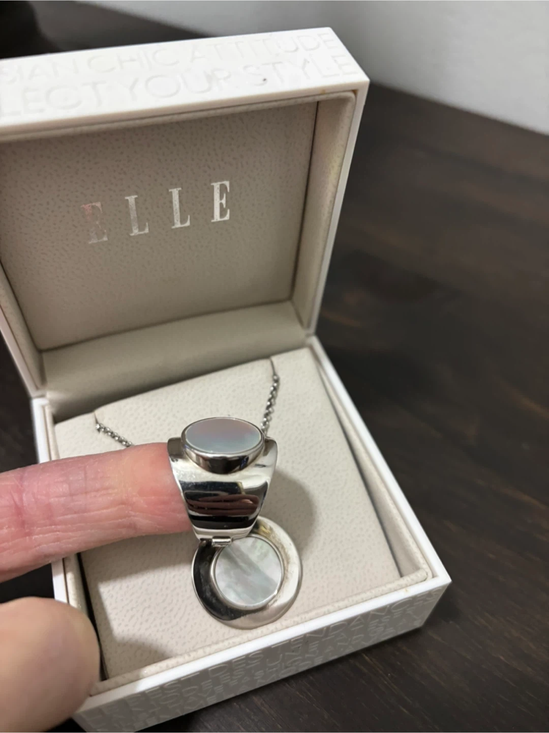 Selling a lovely ELLE necklace and ring set in silver. The set comes in its original box, making it perfect for gifting or treating yourself! The design features a chic, modern look with a round pendant and matching ring. A stylish addition to any jewellery collection