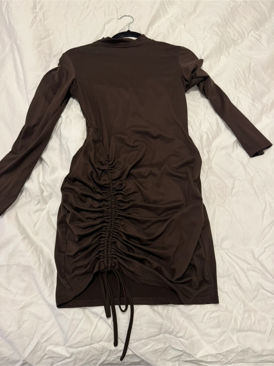 Here's a stylish brown long-sleeve ruched dress! The ruching detail adds a flattering touch to the silhouette. It's perfect for dressing up or down, depending on the occasion. Great for a night out or a casual gathering!