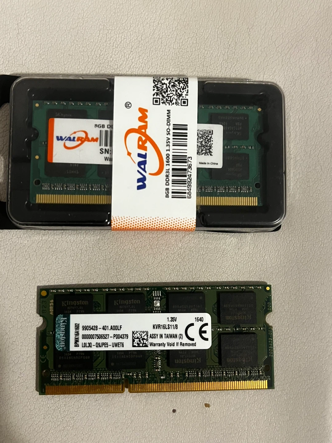 Selling a 16 GB Ram DDR3L 1600 SO-DIMM as (WALRAM 8GB DDR3L 1600 SO-DIMM RAM and 8 GB original kingdtone). Pulled from running system and both tested.
