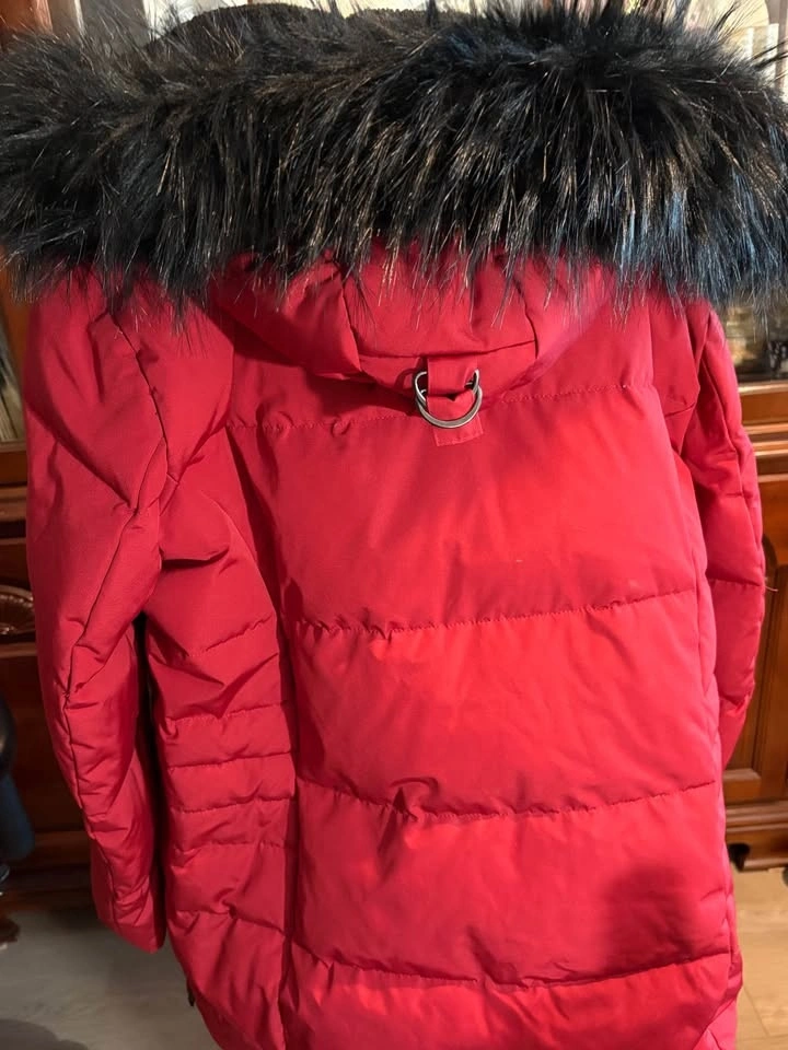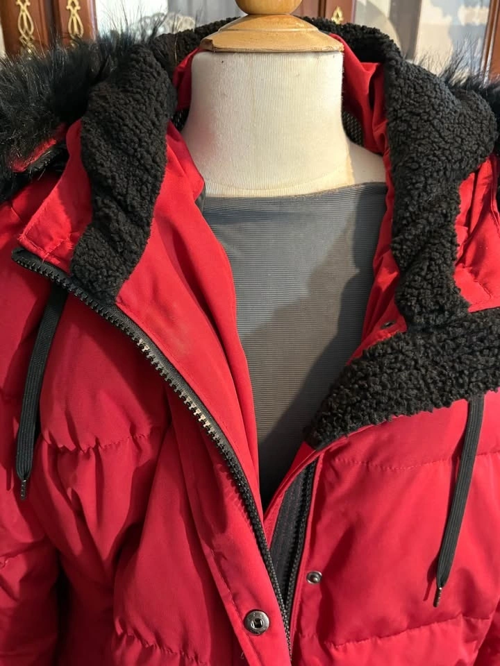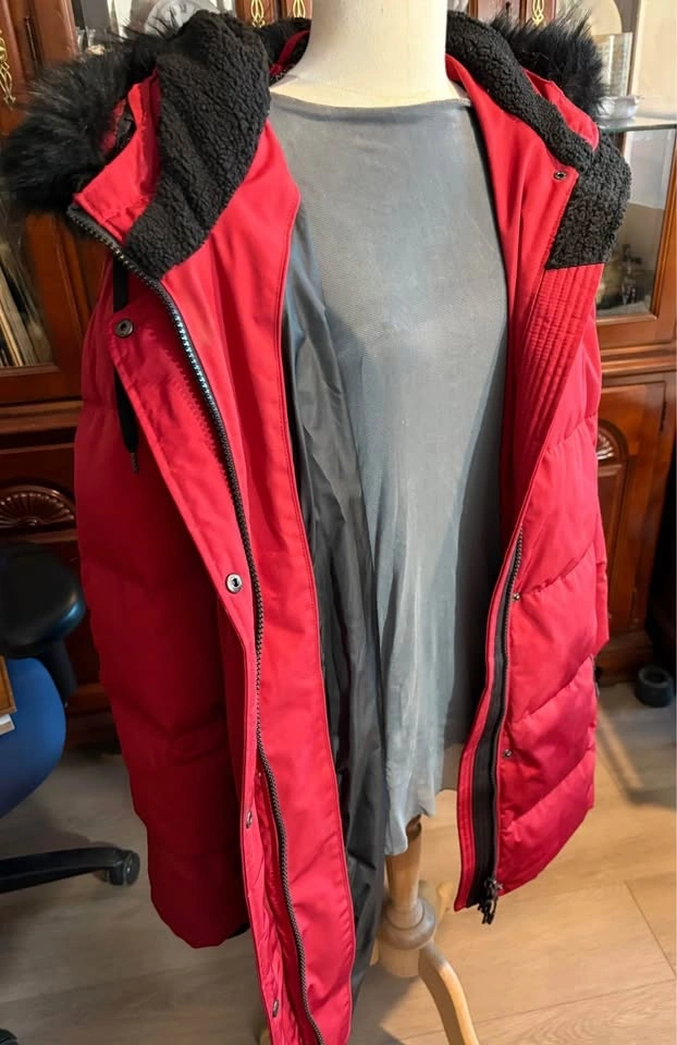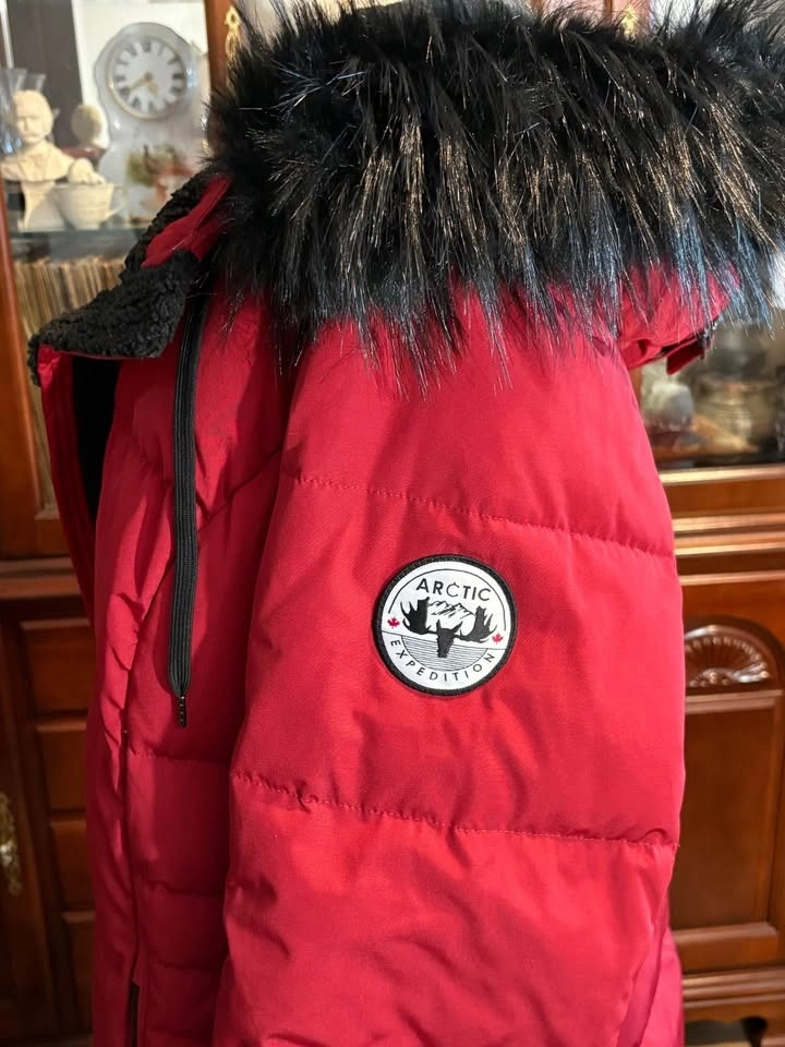 RED Winter Coat Arctic Expedition with Red-Black Fur-Lined Hoodie. Knee Length. Designed in Canada. Size 1X/1TG. Gift I Never Wore.