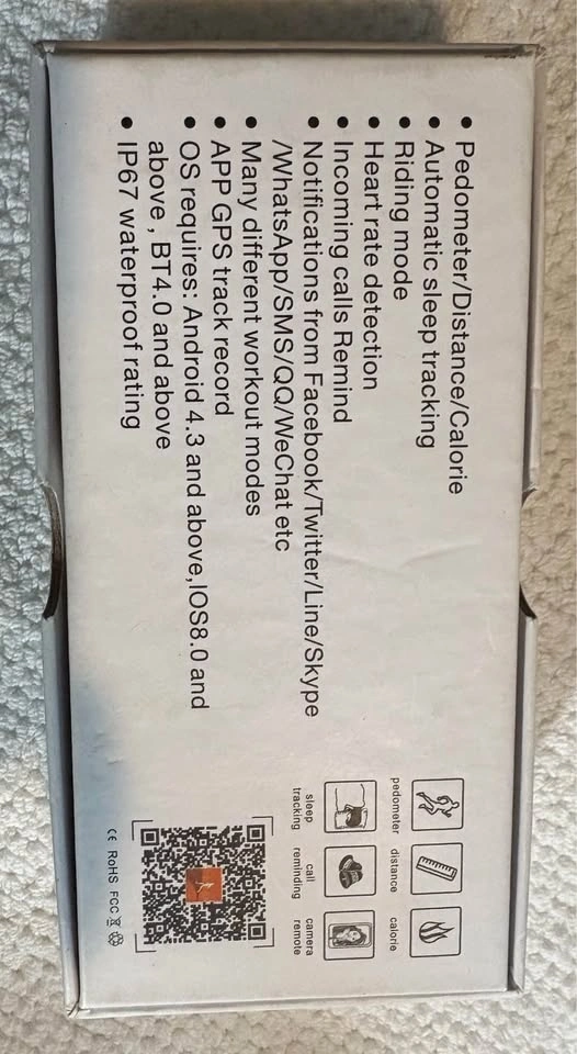 This smart wristband features pedometer, distance, and calorie tracking. It also includes a riding mode, heart rate detection, incoming call reminders, and notifications from various apps like Facebook, Twitter, Line, Skype, WhatsApp, SMS, QQ, and WeChat. It offers many different workout modes and app GPS track recording. Requires Android 4.3 and above.