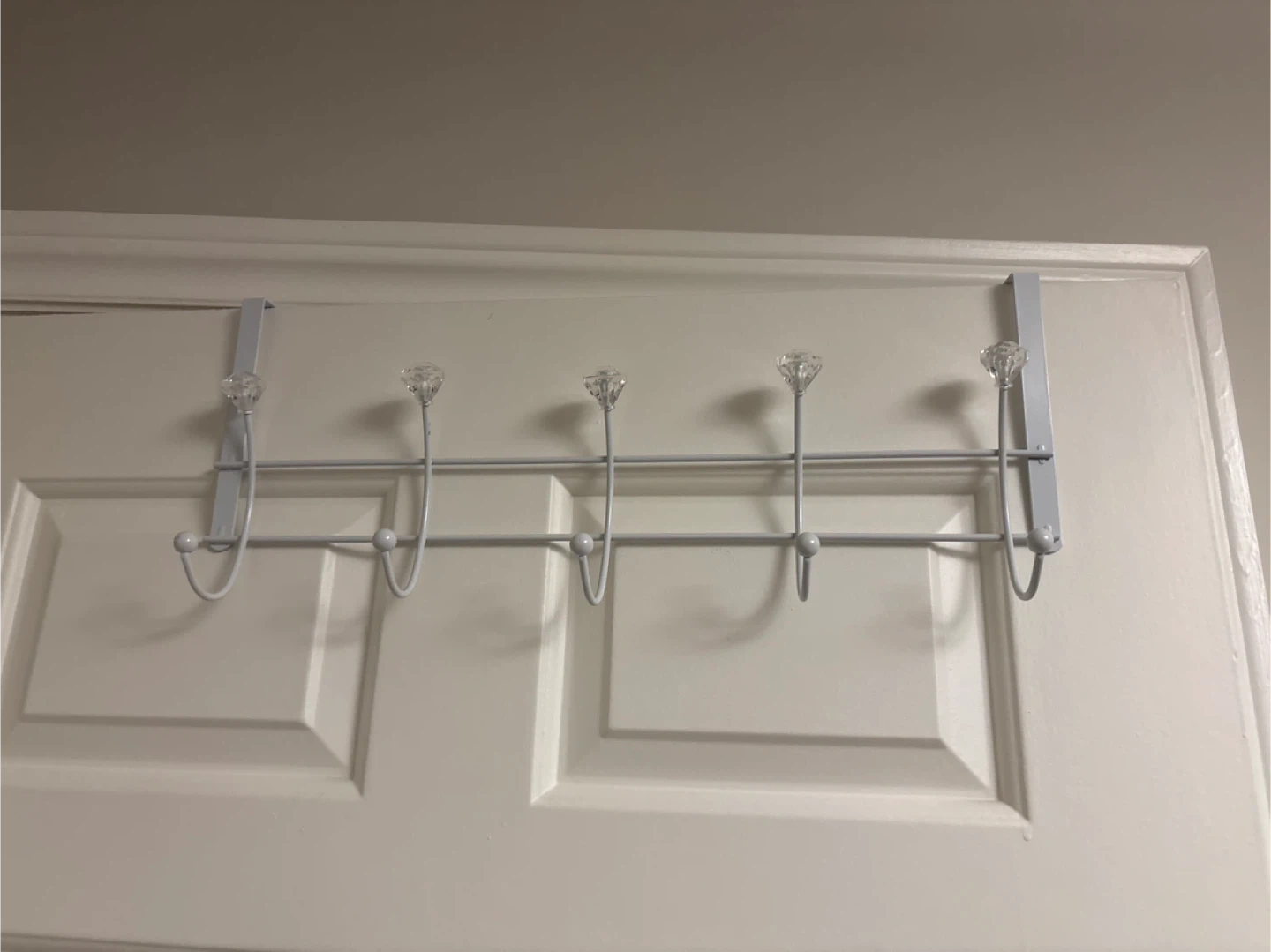 This is an over-the-door hook rack. It's perfect for adding extra hanging space in your closet or bathroom. The rack has five hooks with crystal-like knobs.