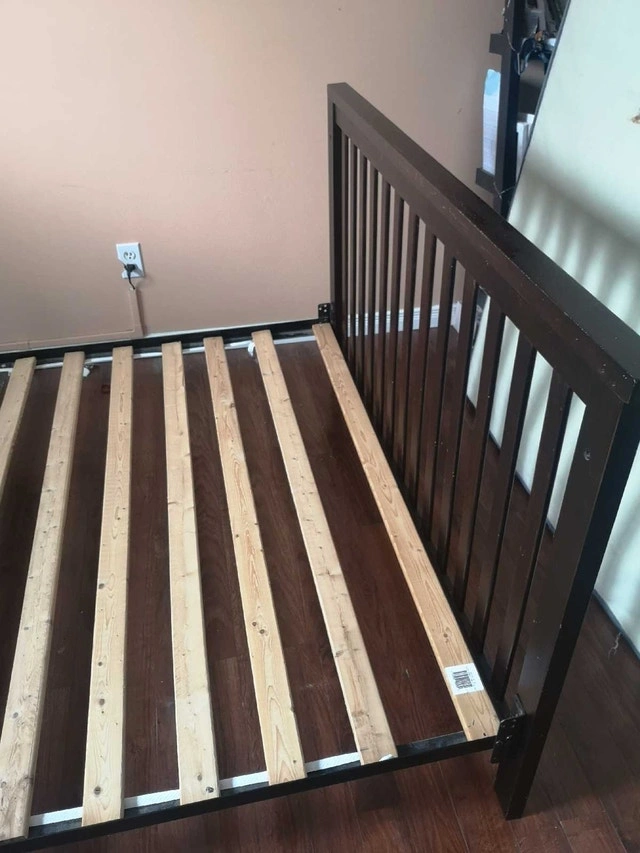 Used double bed frame, perfect for a guest room or a starter bed. It's sturdy and in good condition with a dark brown finish. Two mattresses are also available for free if interested. Priced to go!