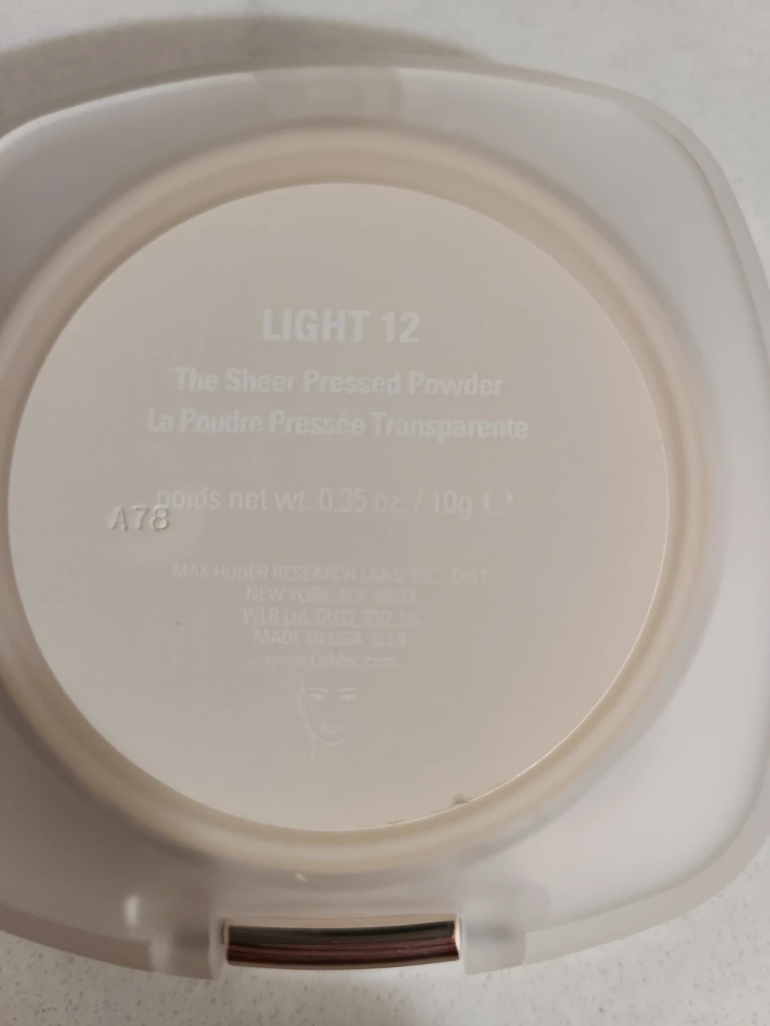 La Mer The Sheer Pressed Powder in Light 12. It comes with the original sponge applicator. The powder is a light shade and provides a sheer finish.