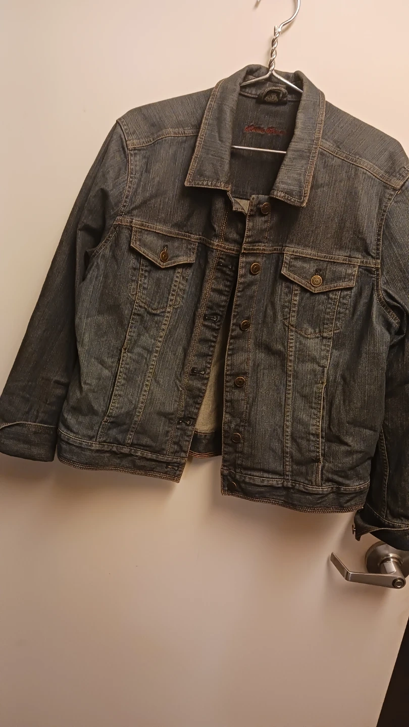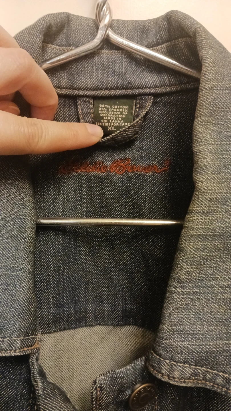 Selling an Eddie Bauer denim jacket in size XL. It's made of 98% cotton and 2% spandex, so it's comfortable and has a bit of stretch. Great for layering or wearing on its own!