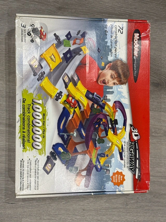Unleash your child's inner engineer with this Modular 3D Highway construction toy! Featuring 72 pieces, this set allows for over 1,000,000 track combinations. It is in used condition with some wear and tear on the box but is otherwise in great condition. * 72 Construction Pieces * Create Endless Track Combinations * Develop 3D Thinking & Creativity