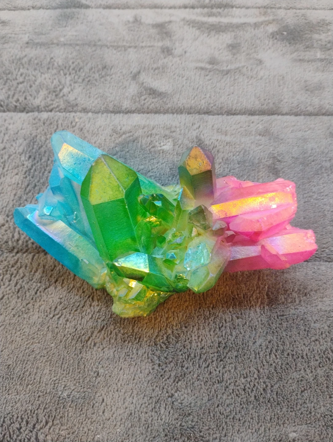 Selling a beautiful aura quartz crystal cluster with vibrant colours! It features a mix of blue, green, and pink hues that shimmer in the light. This piece would make a great addition to any crystal collection or as a unique decorative item for your home