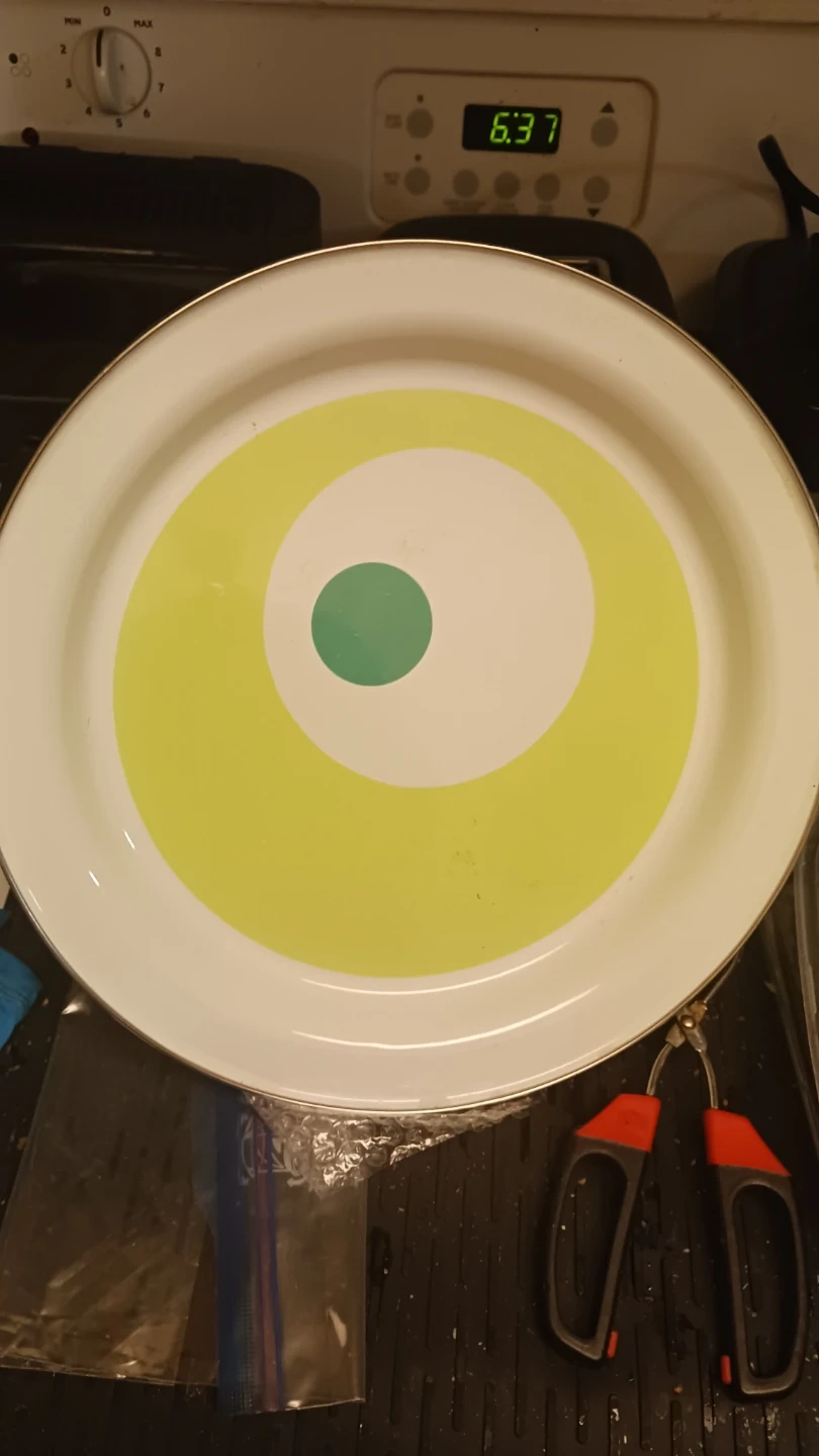 Selling a decorative plate that would look great in any home! It's mostly white with a cool yellow and green circle design in the middle. It's in great condition and ready for a new home!