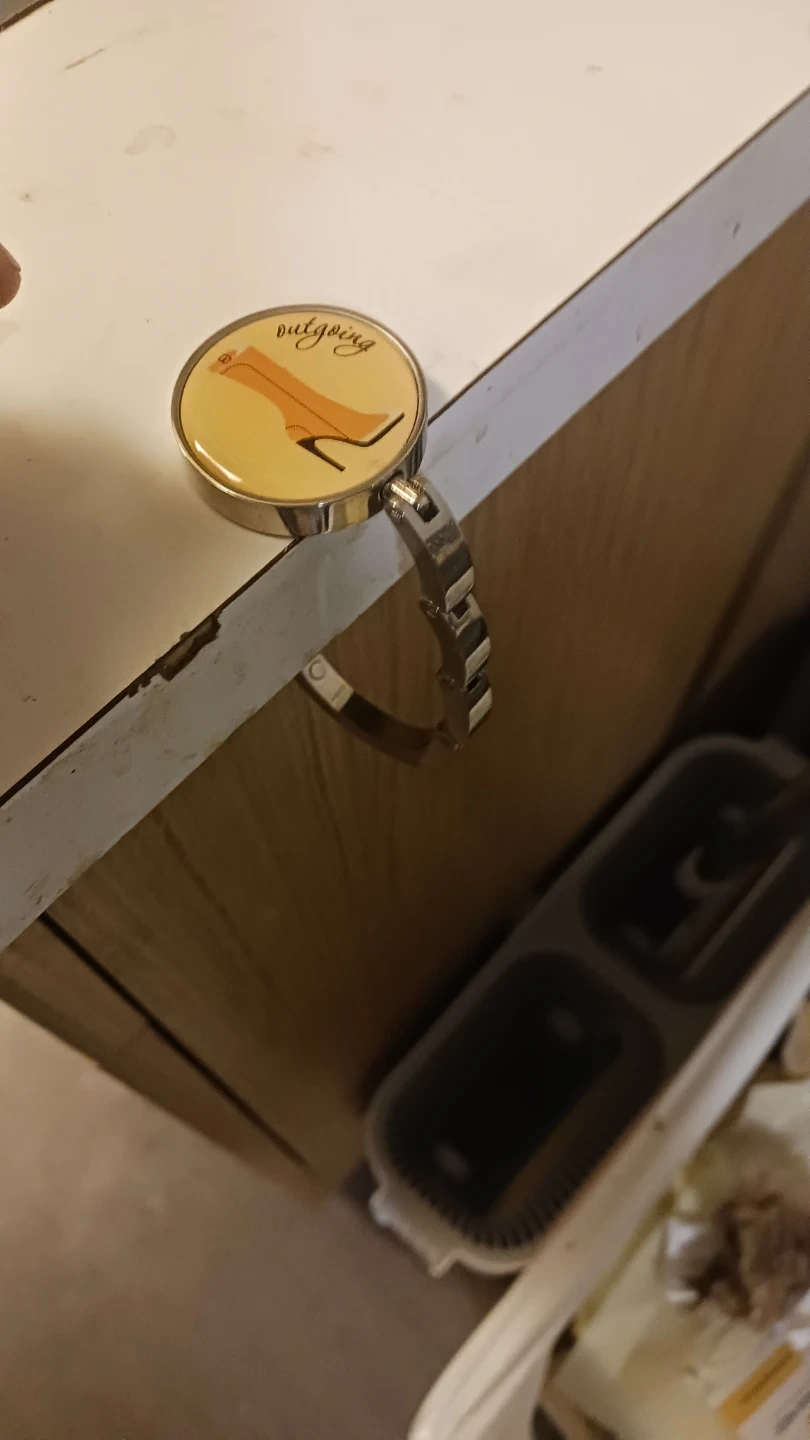 This is a purse hanger with an "outgoing" design! It's perfect for keeping your purse off the floor when you're out and about. It's in great condition and ready for a new home