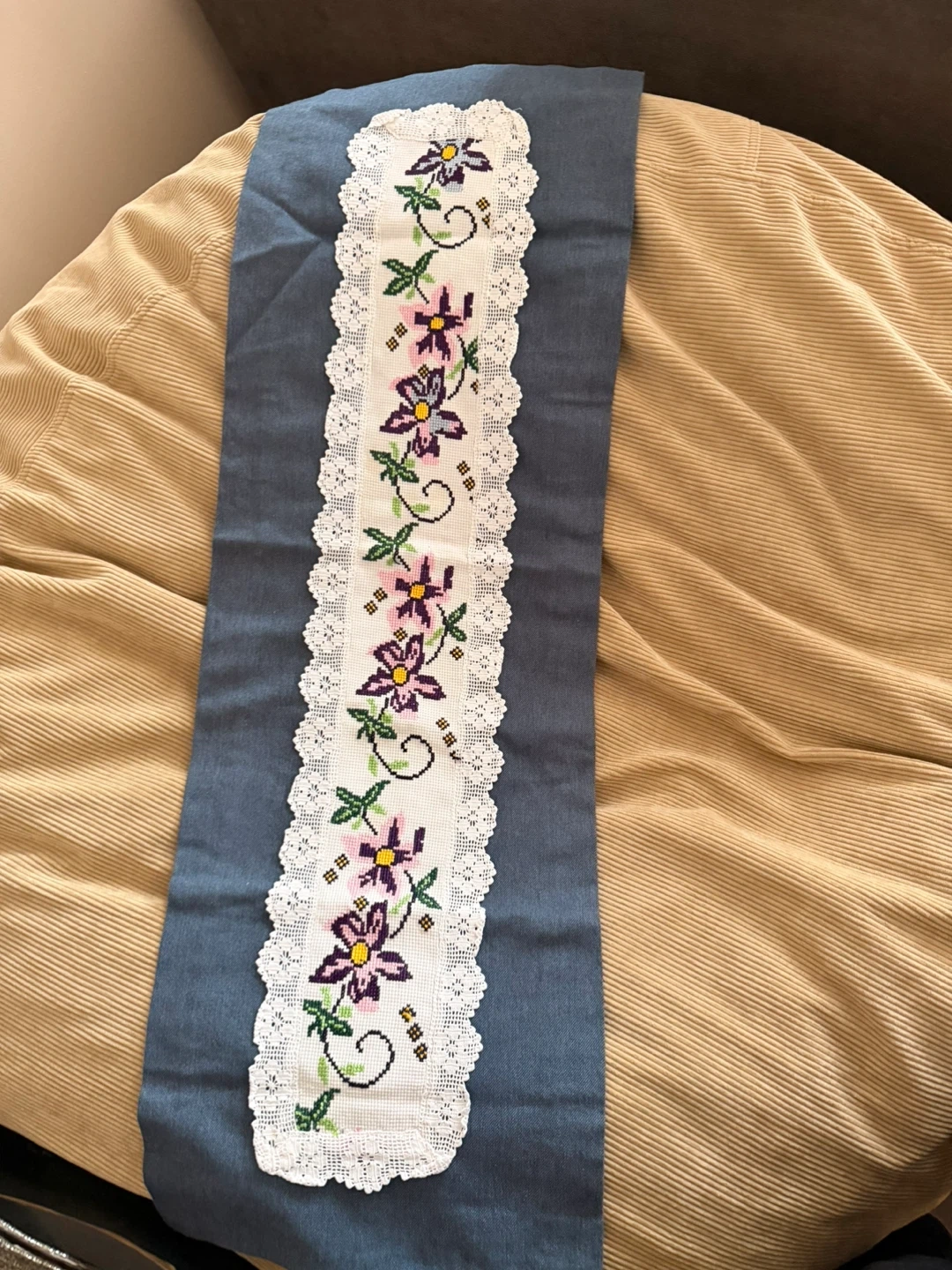 I'm selling a corduroy ottoman cover. It's in great condition and would be a lovely addition to any living space. It has a soft, comfortable texture and a neutral colour that blends well with most decor styles. It has a blue stripe design and also a floral design.