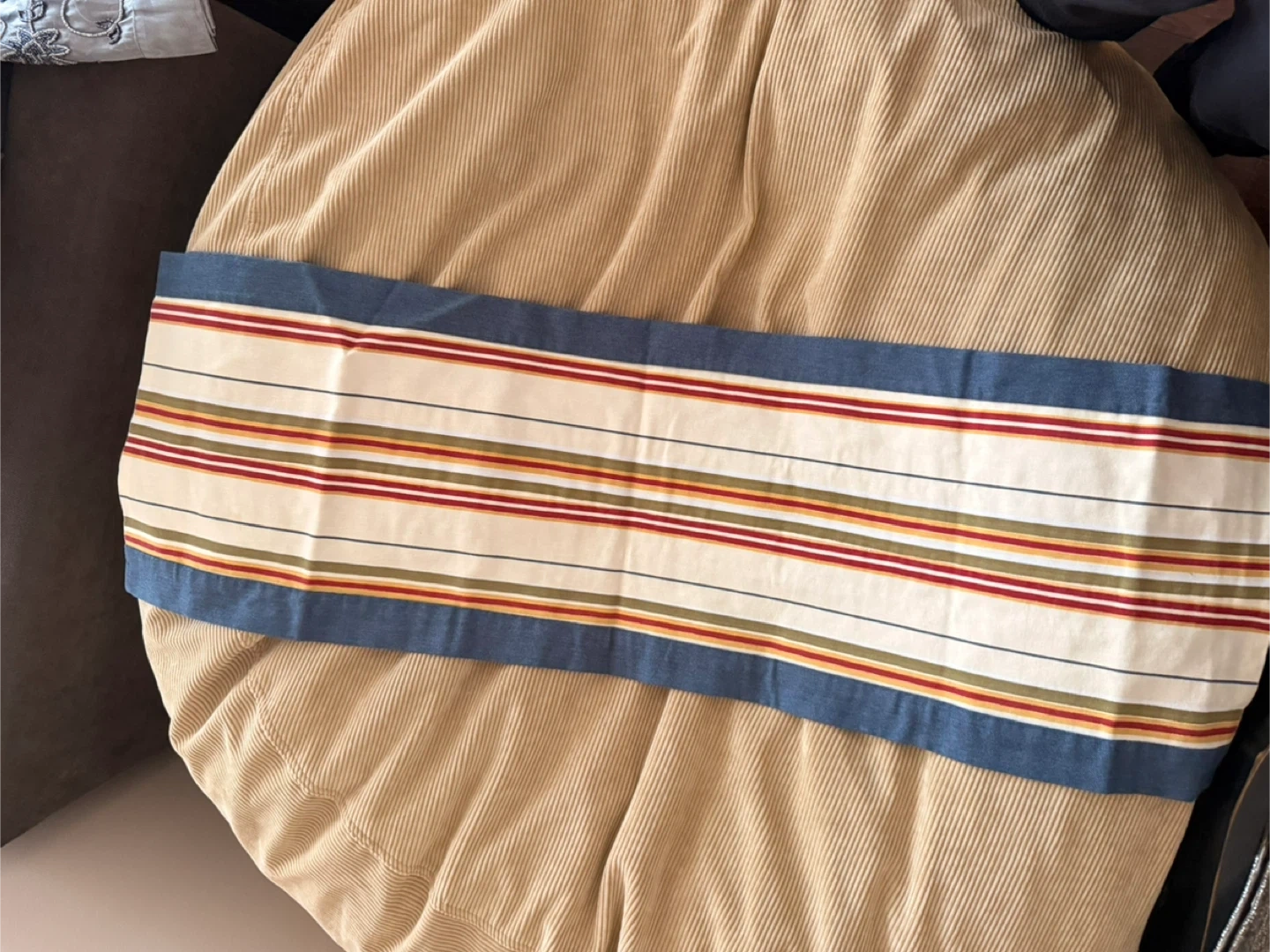 I'm selling a corduroy ottoman cover. It's in great condition and would be a lovely addition to any living space. It has a soft, comfortable texture and a neutral colour that blends well with most decor styles. It has a blue stripe design and also a floral design.