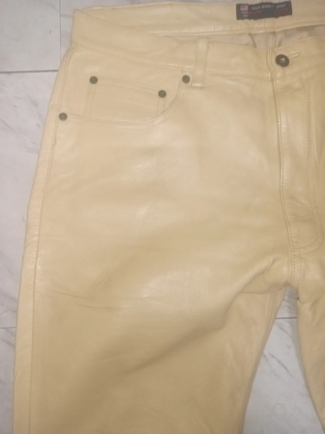 Selling a pair of Rare Polo Jeans Company leather pants in a light cream color. They are a size 36 and appear to be in good condition! The pants feature the RL logo on the back pocket.