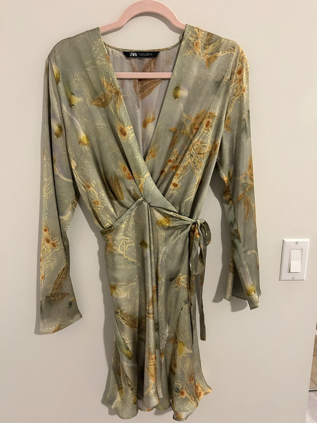 Selling a lovely Zara wrap dress with a unique floral print. It features long sleeves and a flattering wrap design. The dress is a size Large and is made. Perfect for a special occasion or a stylish everyday look!