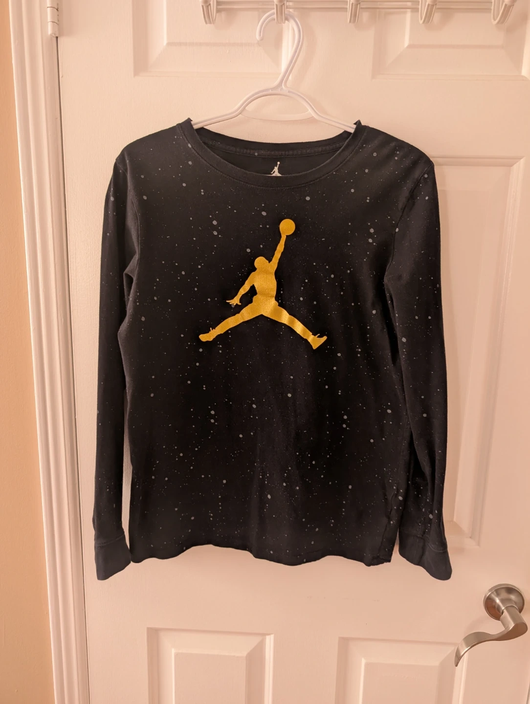 Selling a Jordan long-sleeve shirt in youth size XL, suitable for ages 13-15 years. The shirt is black with a gold Jordan logo and a speckled design. It's in great shape.
