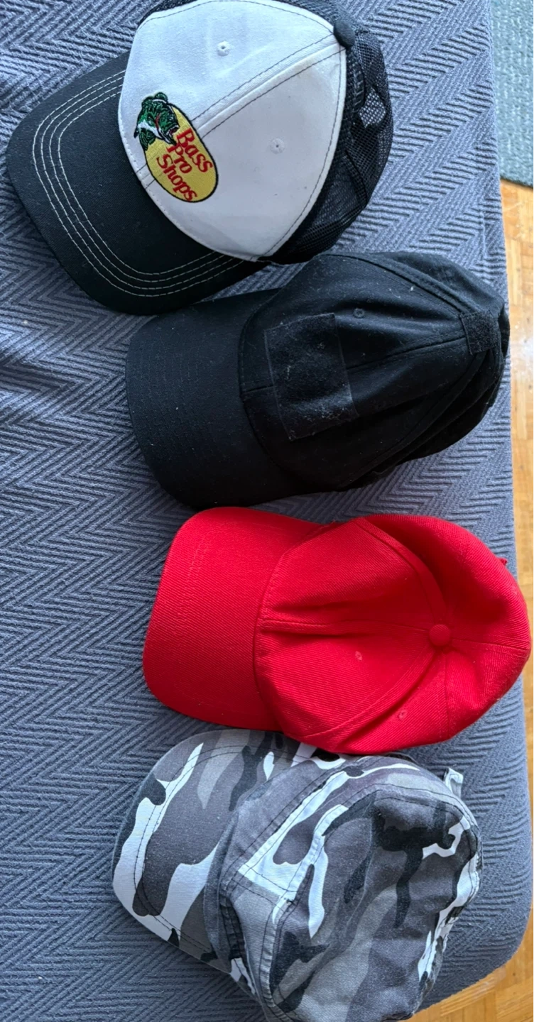 Selling a collection of baseball caps! There's a Bass Pro Shops cap, along with a plain black cap, a red cap, and a grey camo cap. All in good used condition.