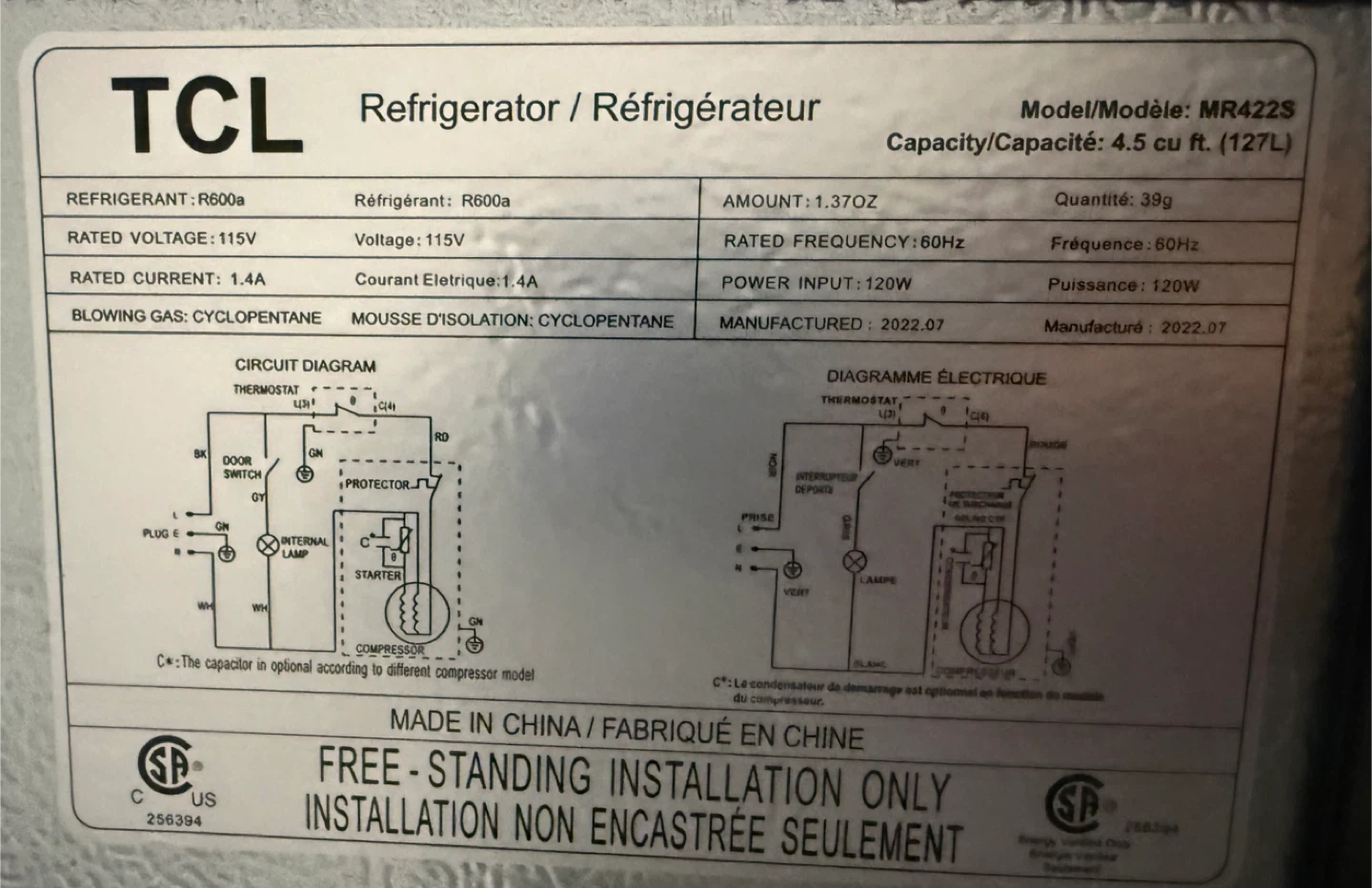 Selling a TCL refrigerator, model MR422S with a capacity of 4.5 cu ft (127L). It's in great shape and ready to keep your food and drinks cold! Manufactured in 2022 July.