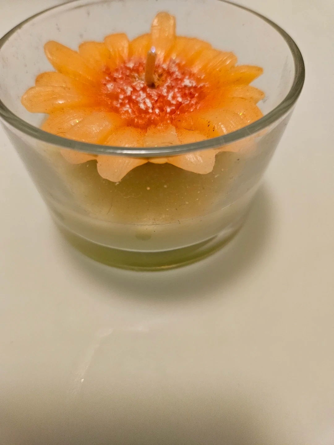 Decorative flower candle, perfect for adding a touch of floral charm to any space. It's set in a clear glass holder, showcasing its unique design.
