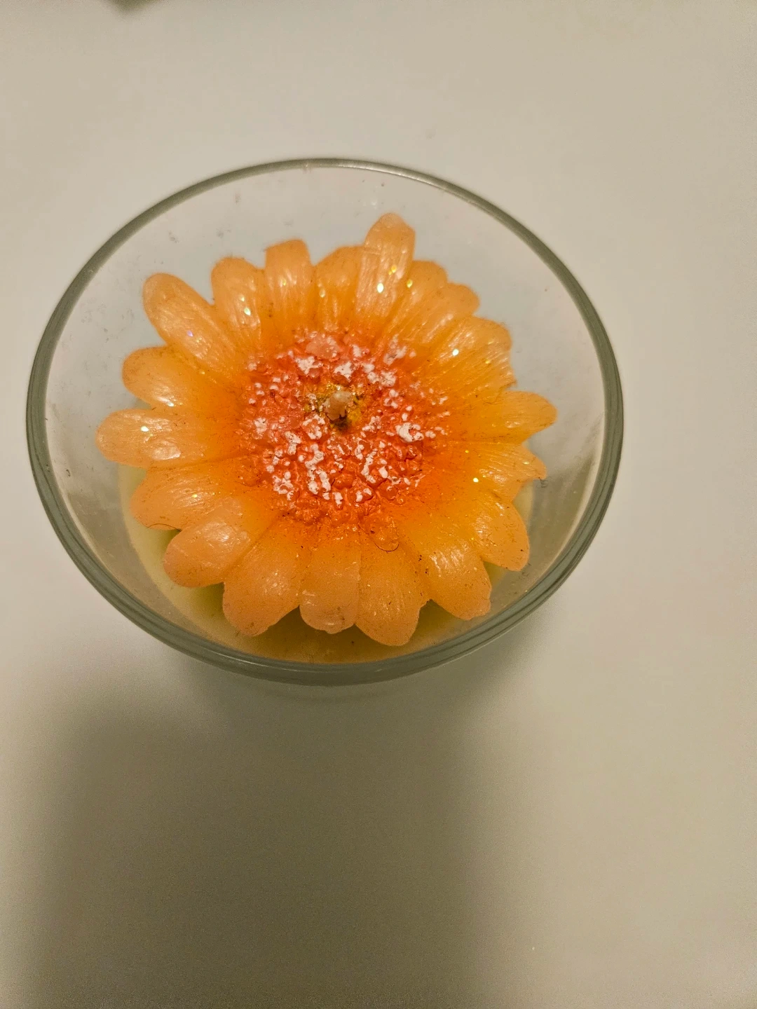 Decorative flower candle, perfect for adding a touch of floral charm to any space. It's set in a clear glass holder, showcasing its unique design.