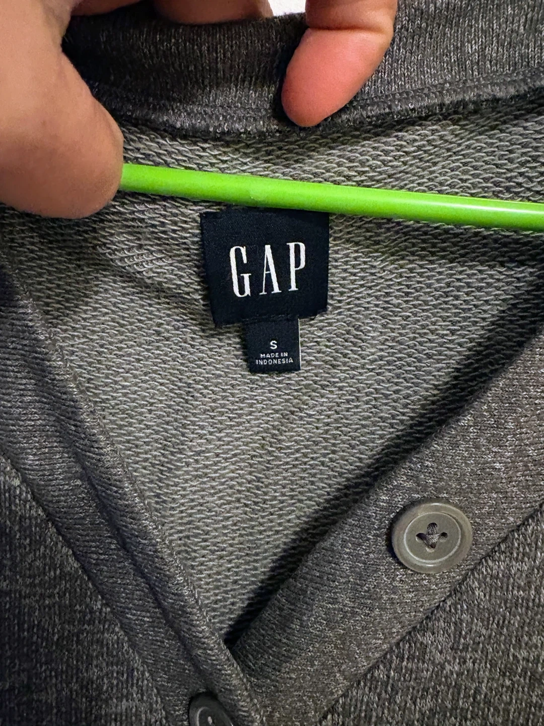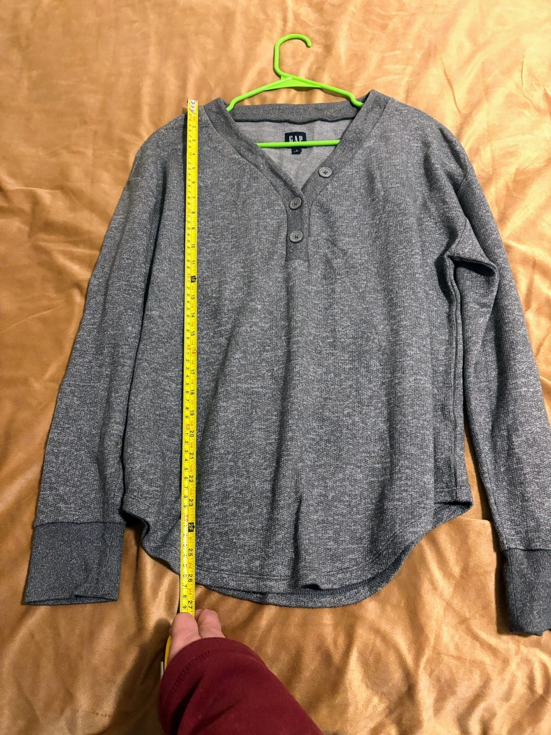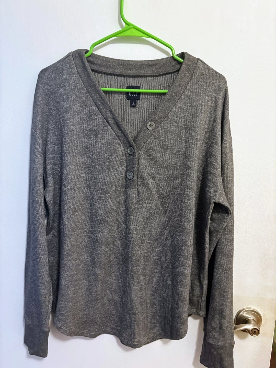 Selling a cute gray long-sleeve shirt from GAP! It's a size small and in great condition. The shirt has a v-neck with three buttons down the front. Perfect for layering or wearing on its own