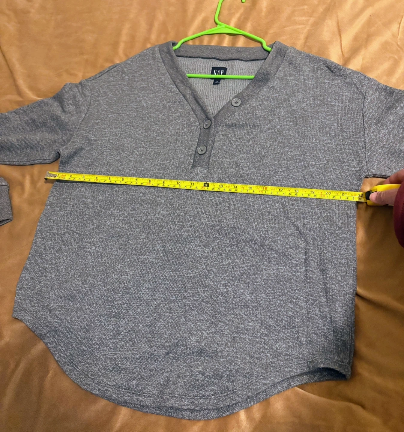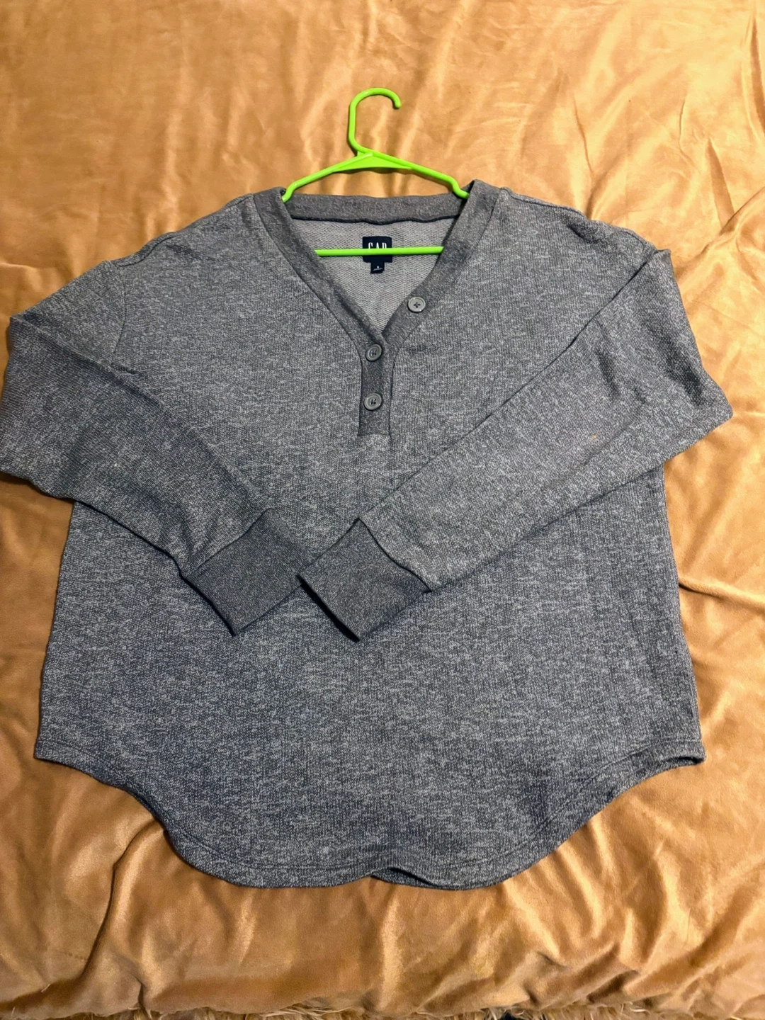 Selling a cute gray long-sleeve shirt from GAP! It's a size small and in great condition. The shirt has a v-neck with three buttons down the front. Perfect for layering or wearing on its own
