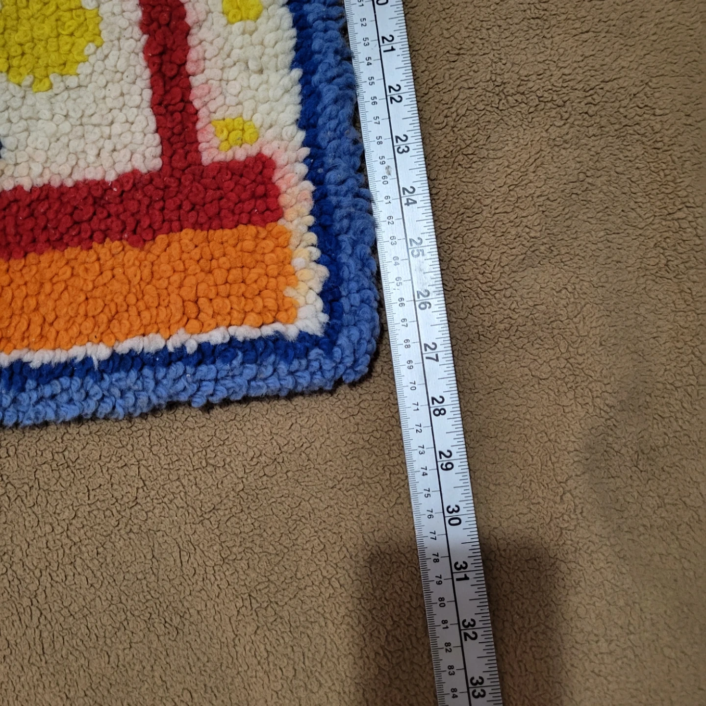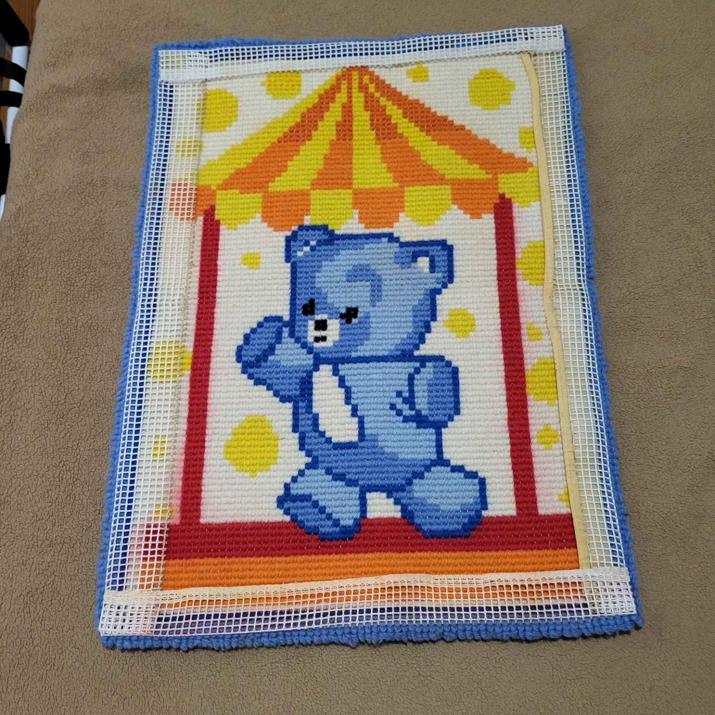 Selling a cute handmade latch hook rug! It features a blue bear under a striped canopy. It measures approximately 20 inches by 27 inches. A charming addition to any room!