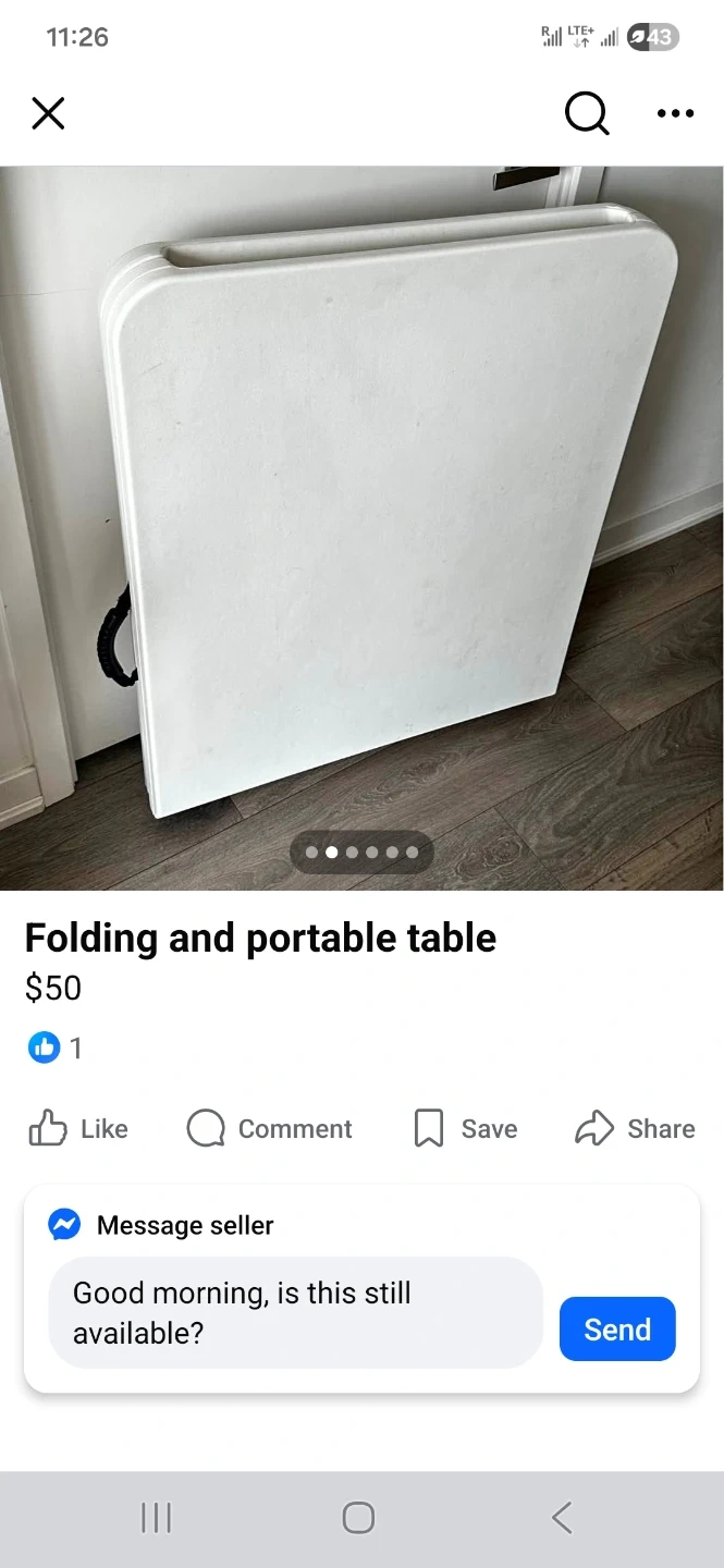 Selling a folding and portable table! It's super handy for when you need extra space. Folds up easily for storage and transport, making it great for small spaces or taking on the go