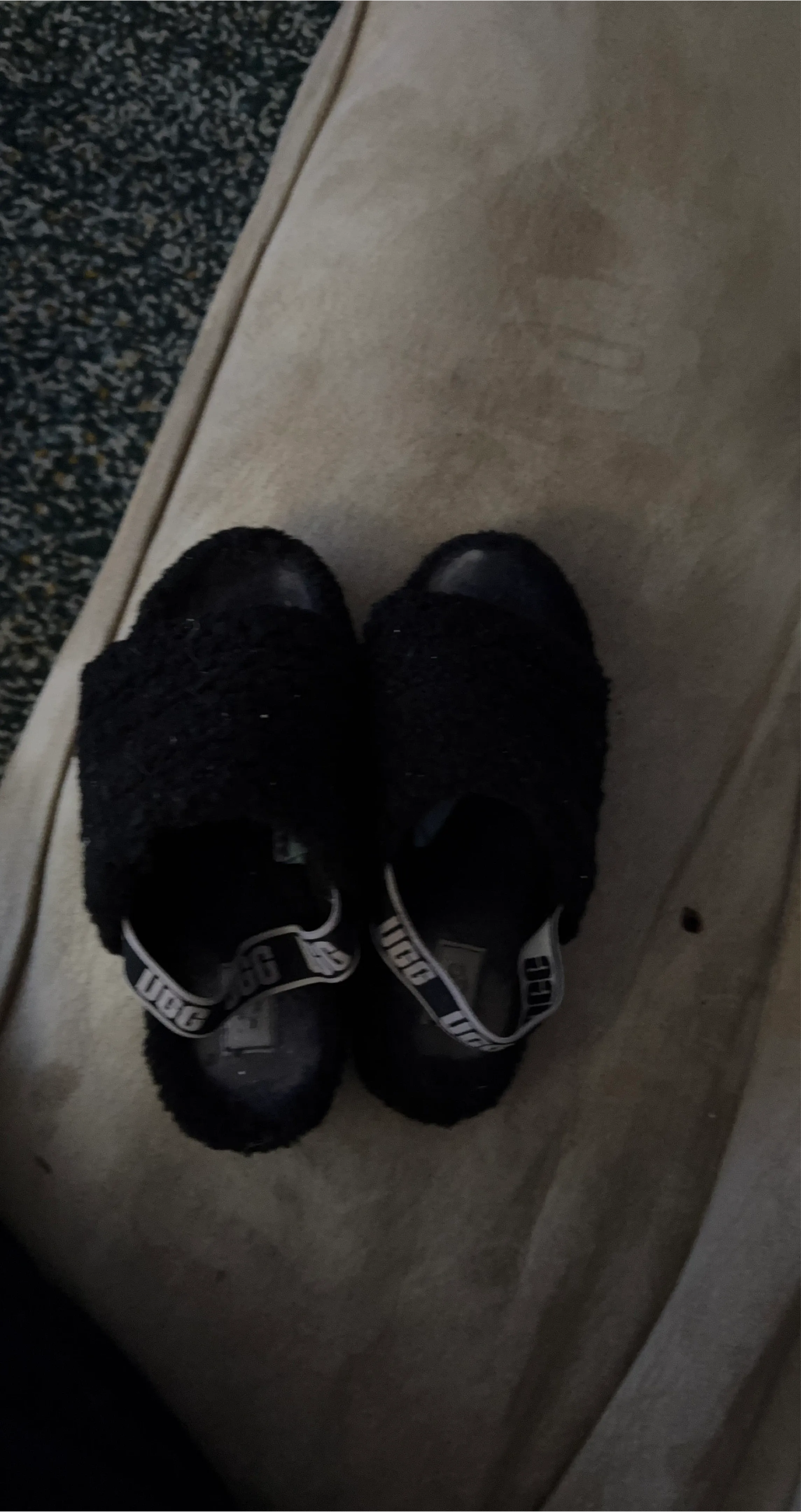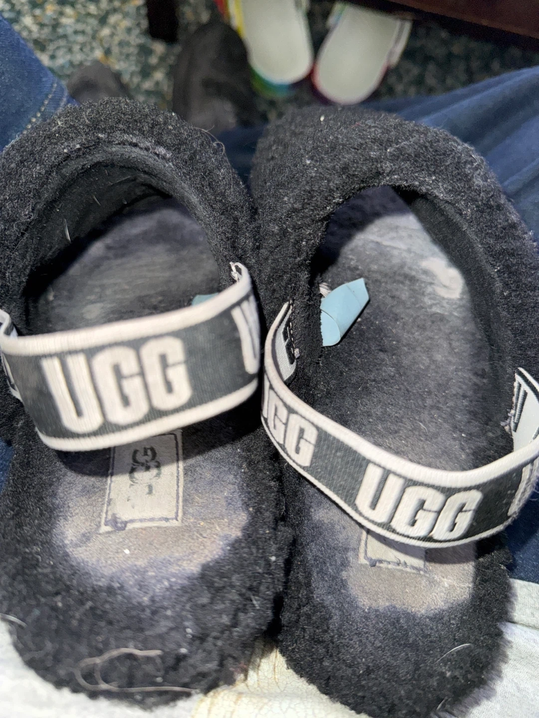 Selling a pair of UGG Fluff Yeah slides in black. They are super comfy and stylish for wearing around the house or even for quick errands. The UGG logo is visible on the strap. They're in good condition and ready for a new home! Little wear in the sole but not much needs good fluffy clean