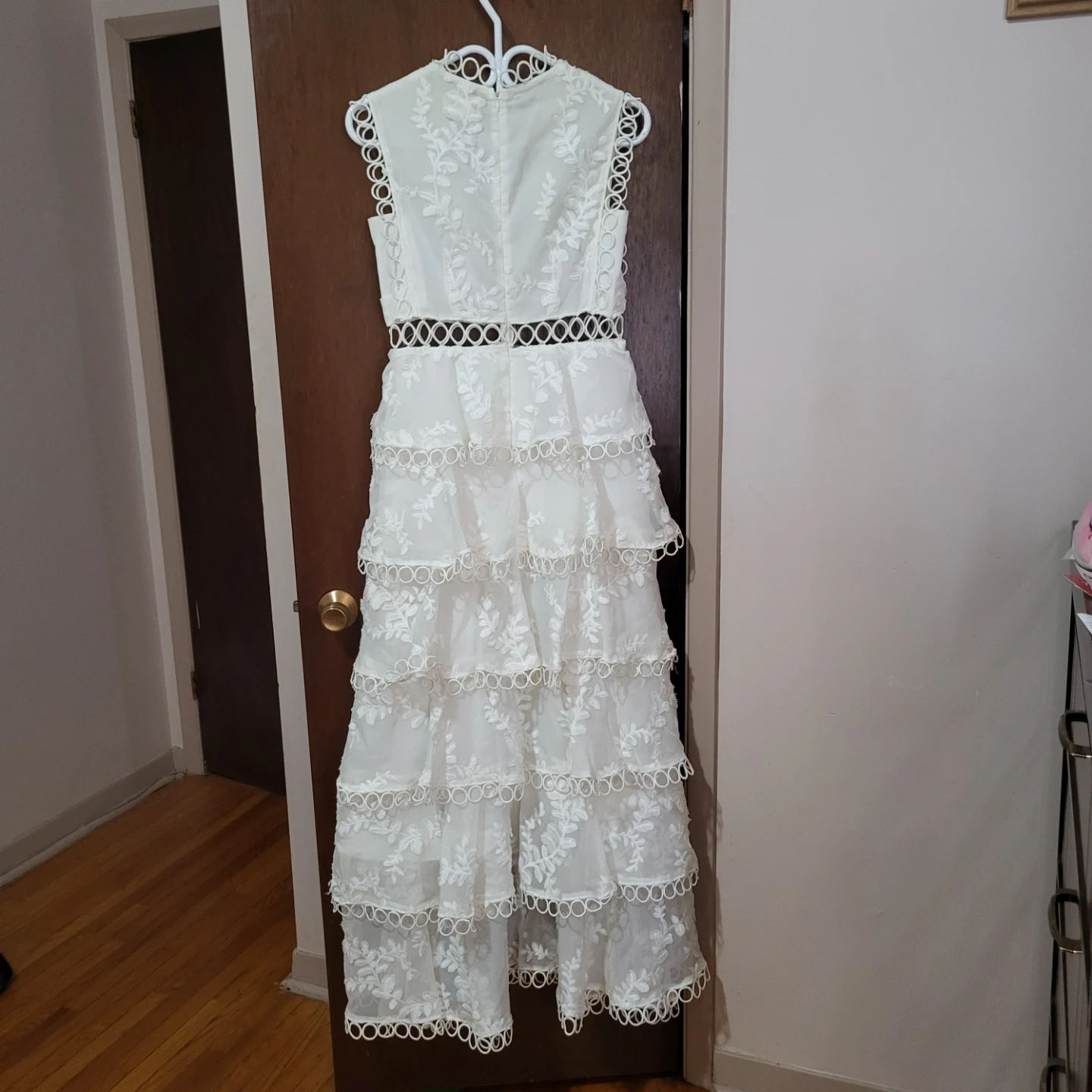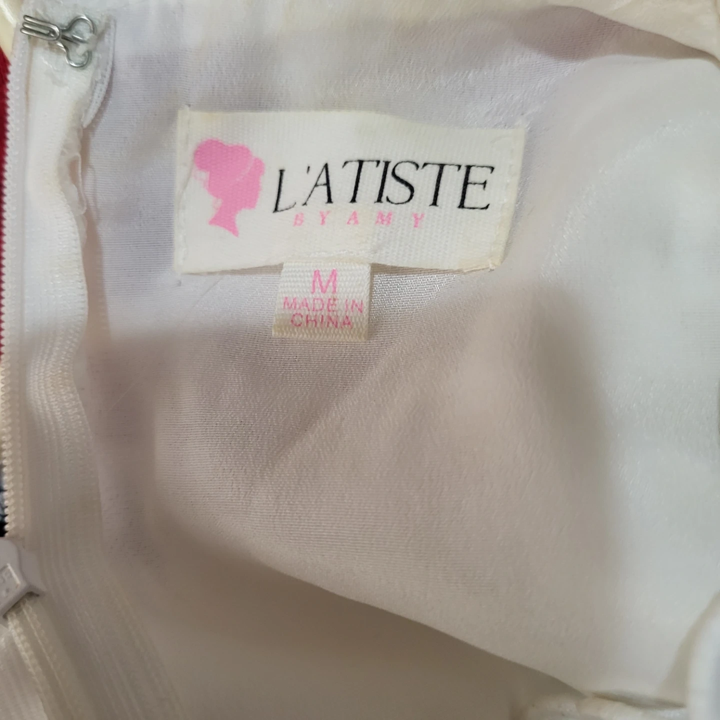 Selling a beautiful white L'ATISTE BY AMY dress in size M. It's made of 100% polyester and features a unique layered design with delicate floral embroidery. Perfect for a special occasion!