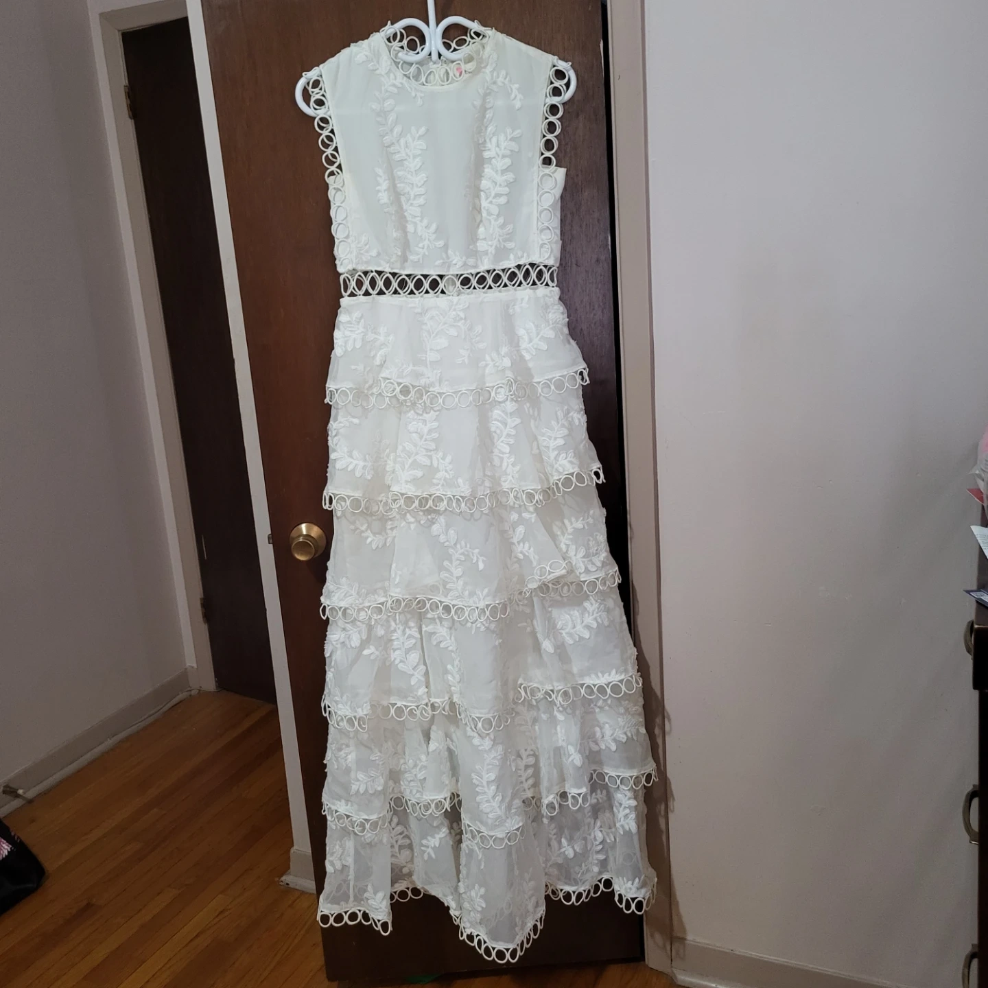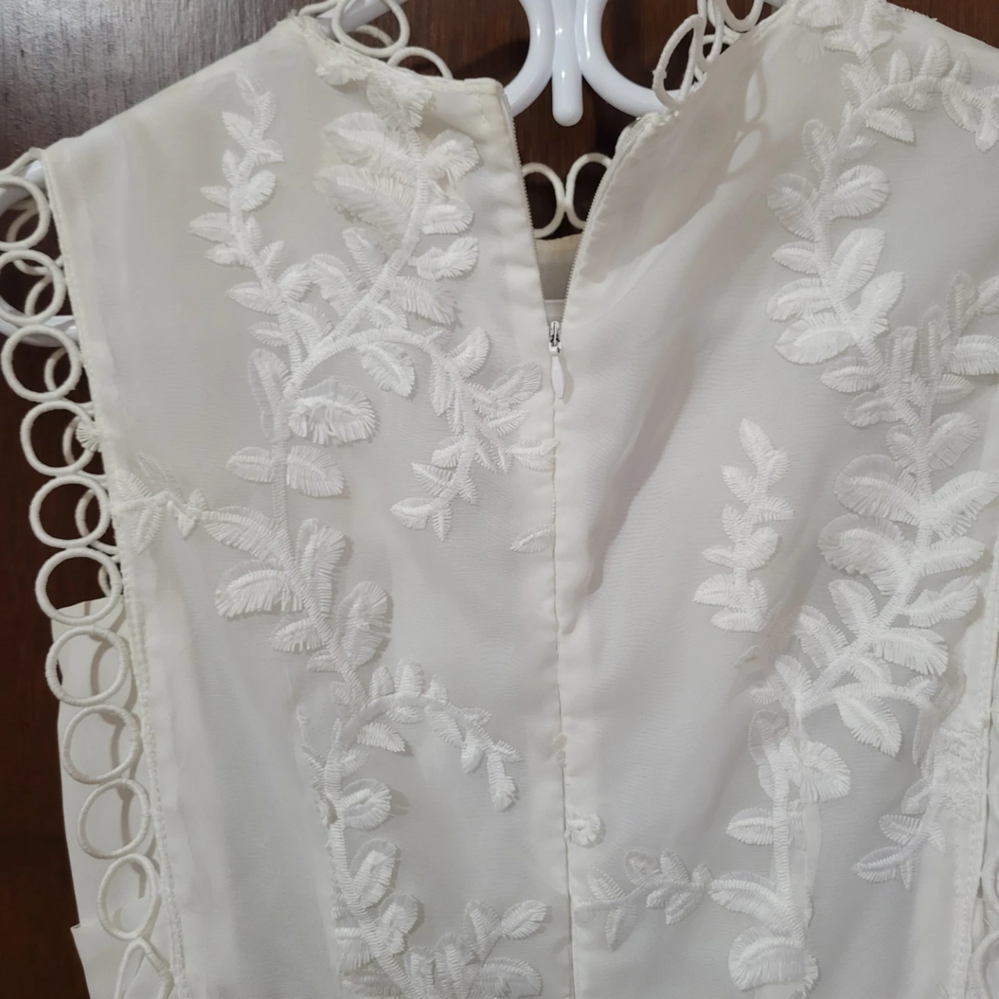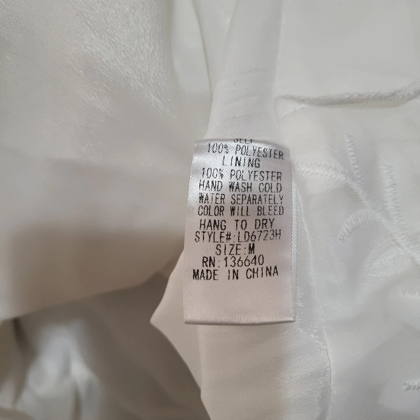 Selling a beautiful white L'ATISTE BY AMY dress in size M. It's made of 100% polyester and features a unique layered design with delicate floral embroidery. Perfect for a special occasion!
