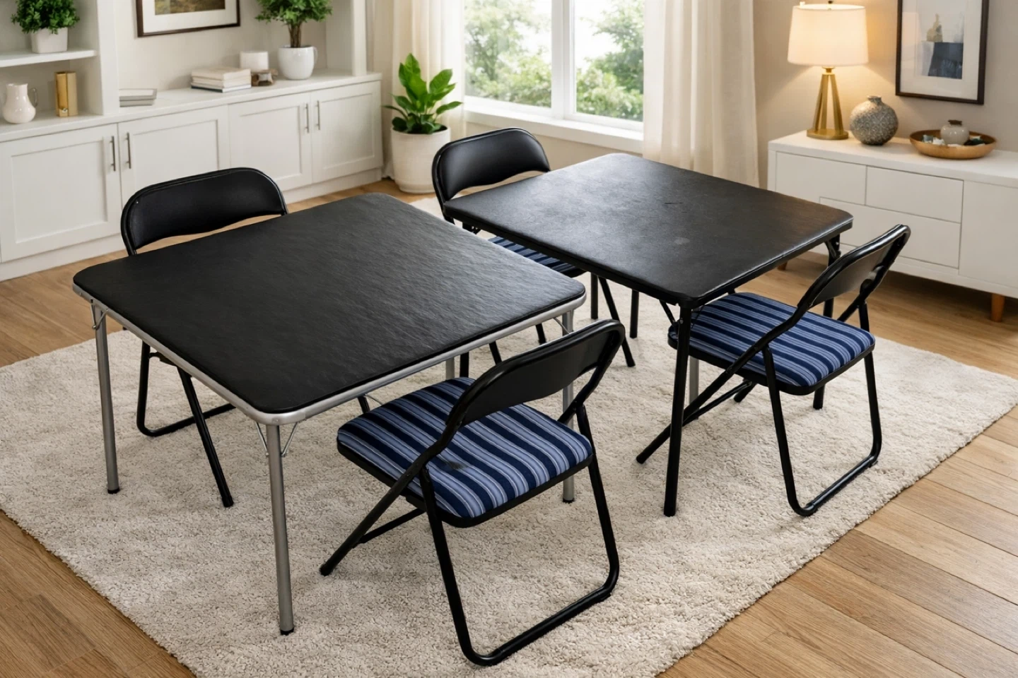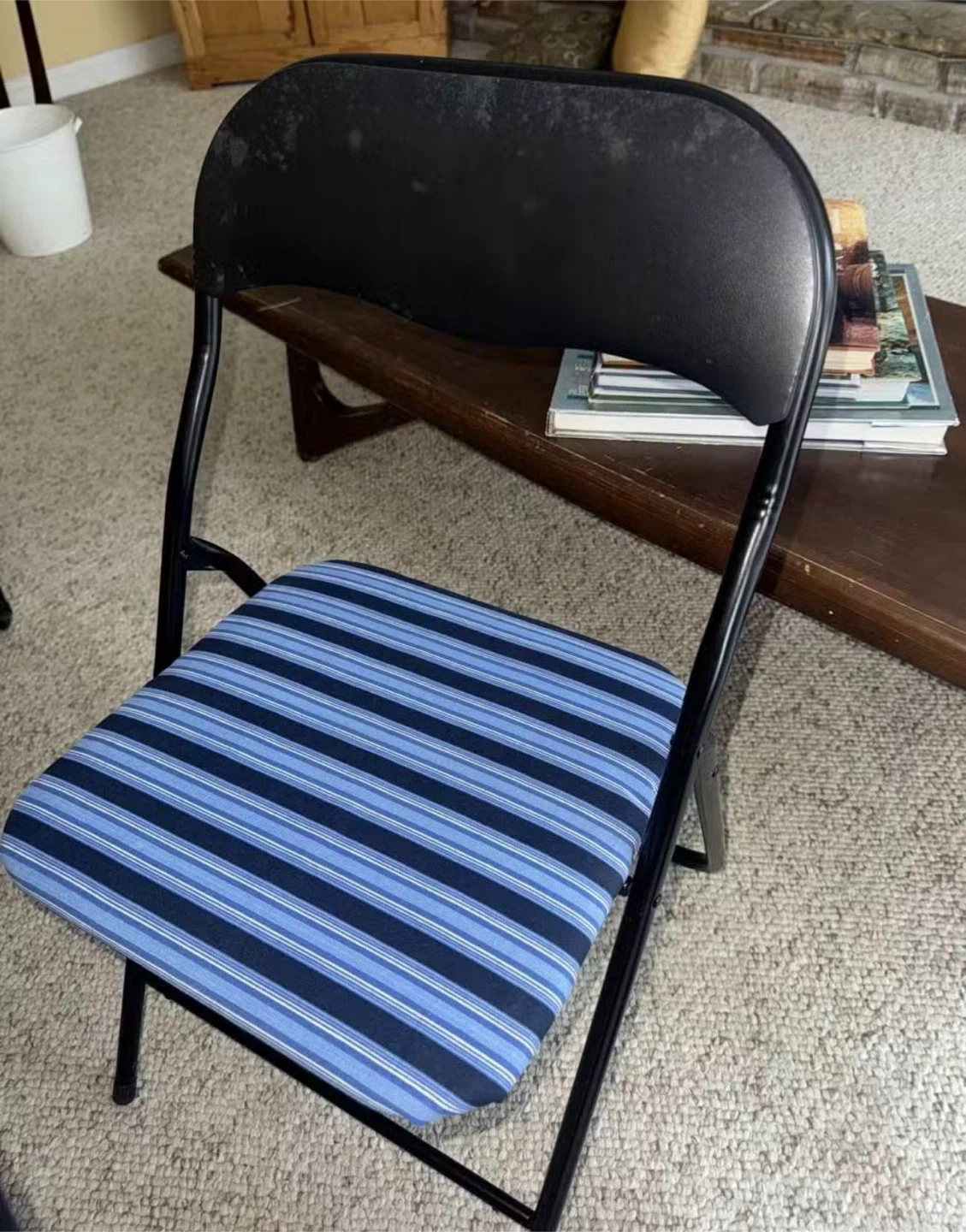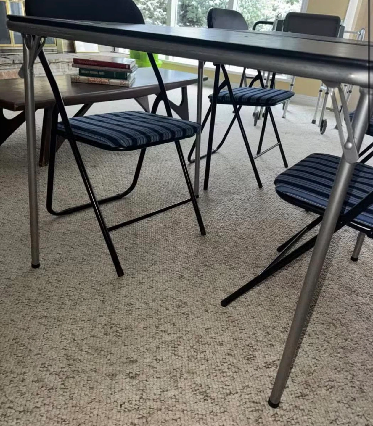 Selling a folding card table with a set of folding chairs. Great for game nights or extra seating during the holidays! The chairs have a blue striped pattern on the seat. The table is black with silver legs.