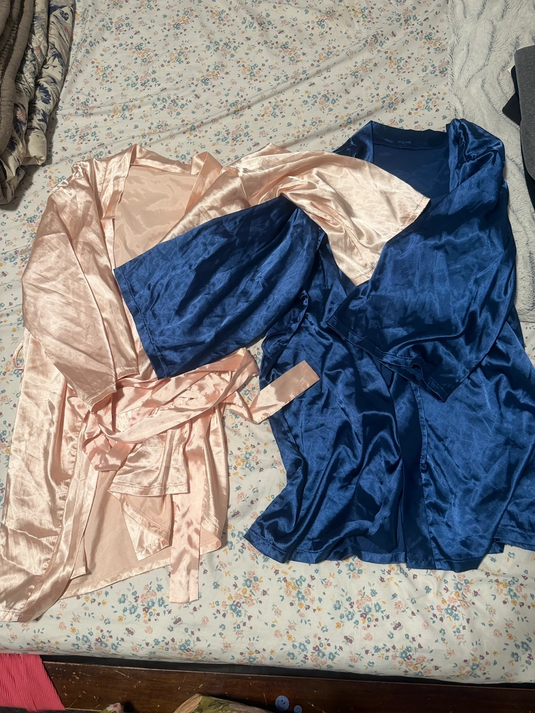 Two silk robes, one in a lovely pink and the other in a rich blue! These robes are perfect for lounging or getting ready. They have a soft, luxurious feel. Both are in great condition!