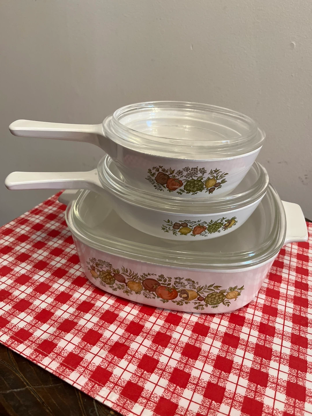Selling a set of vintage Corning Ware casserole dishes! This set includes three white casserole dishes with the "Spice O' Life" vegetable pattern and clear glass lids. They're in great shape and ready for a new home in your kitchen