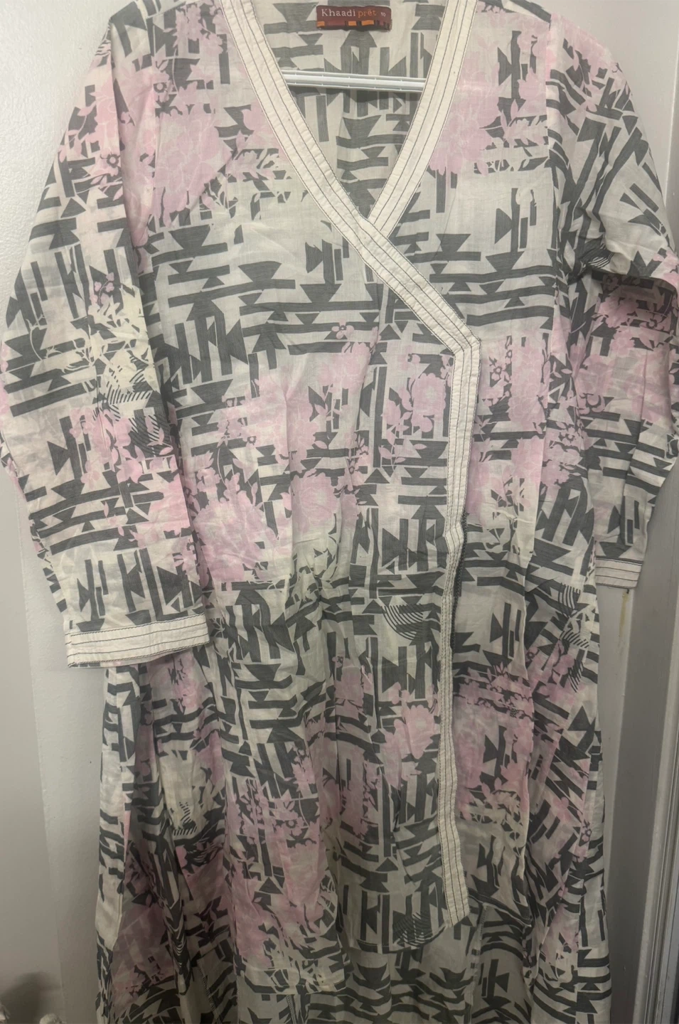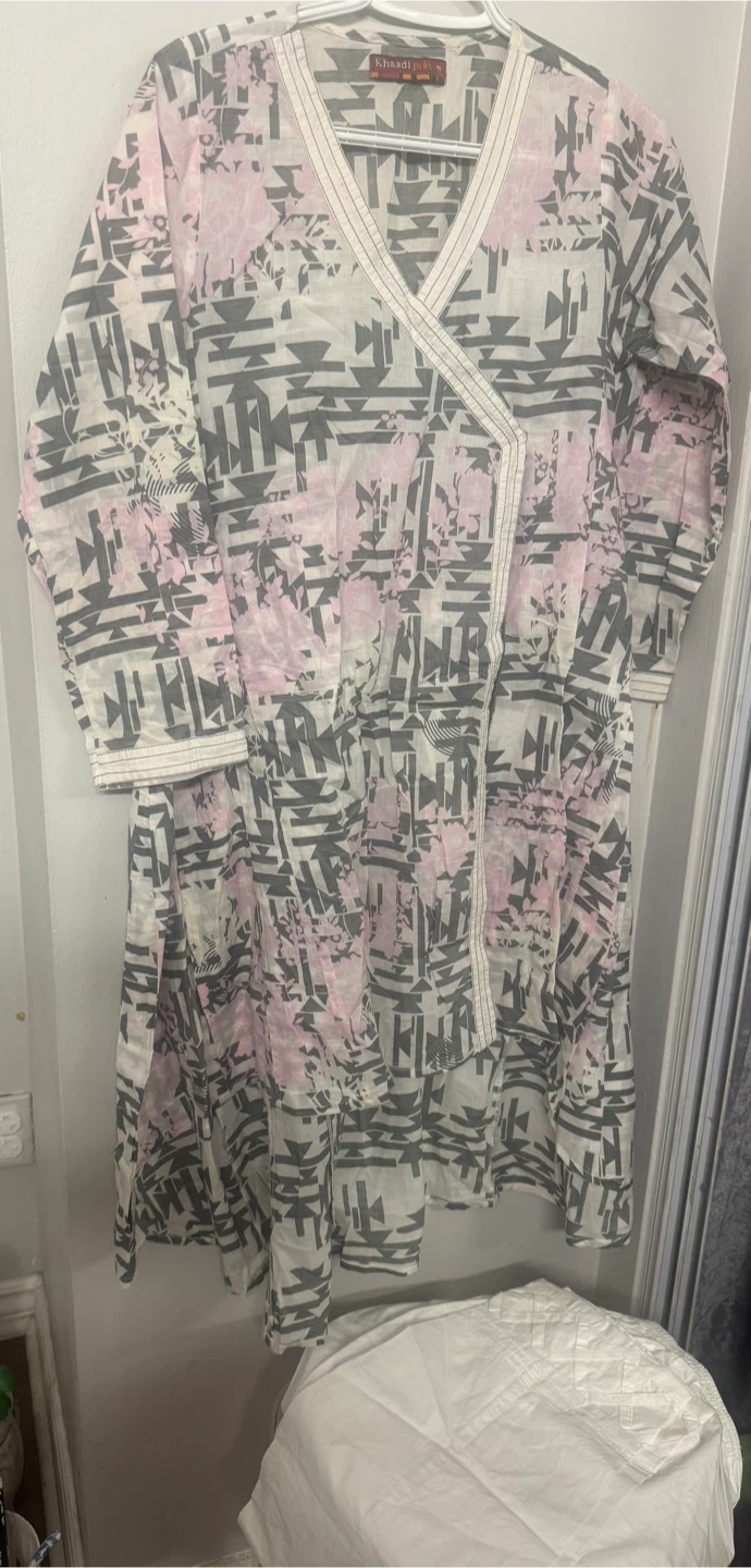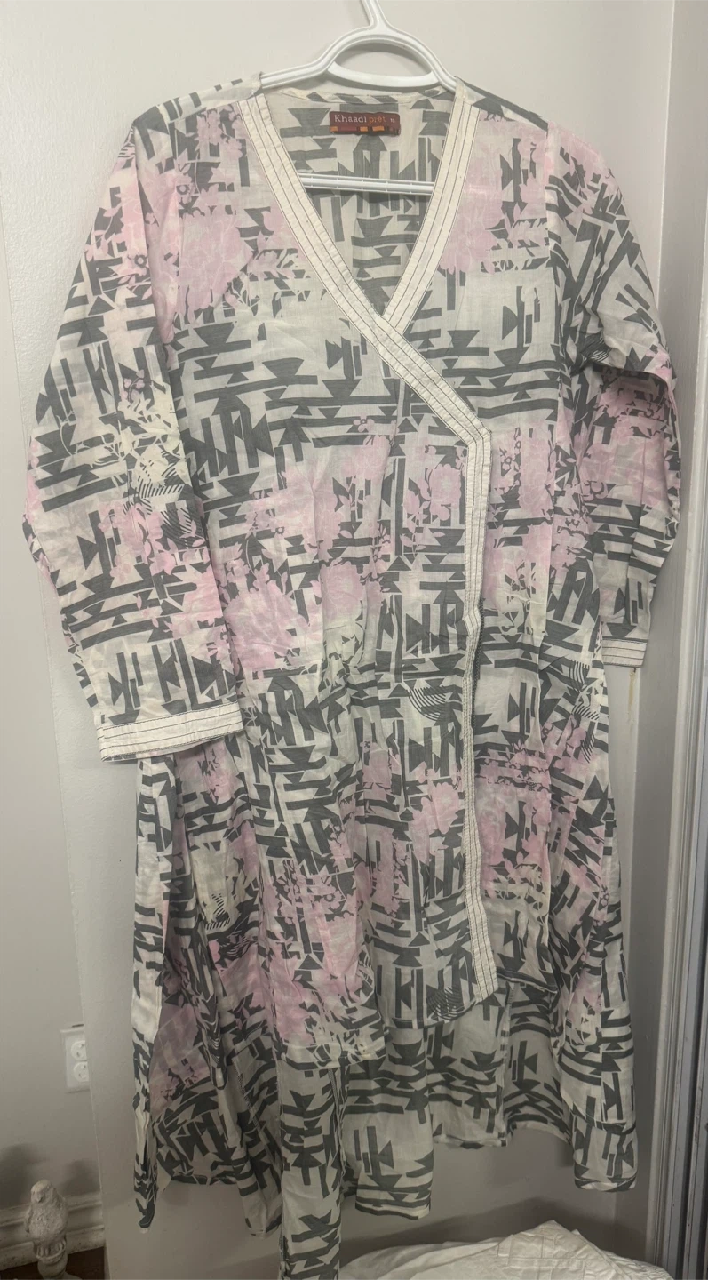This is a Khaadi brand kurti dress. It features a unique print with pink and grey tones angrakha. It is size medium and is in good condition. Perfect for casual wear!