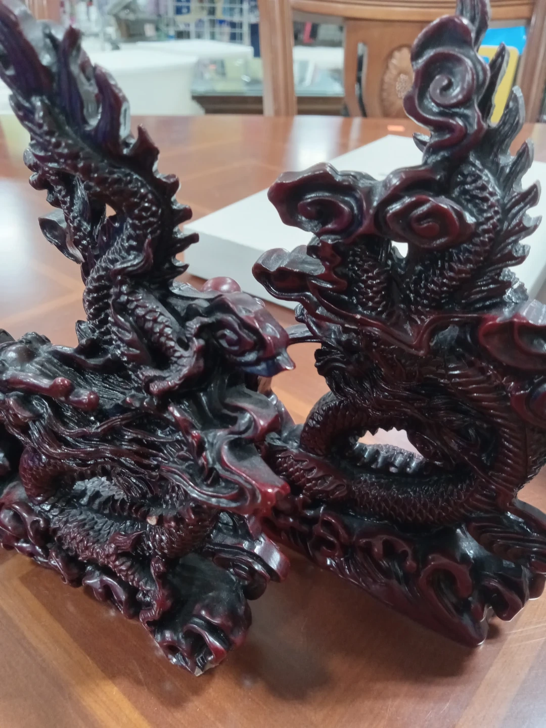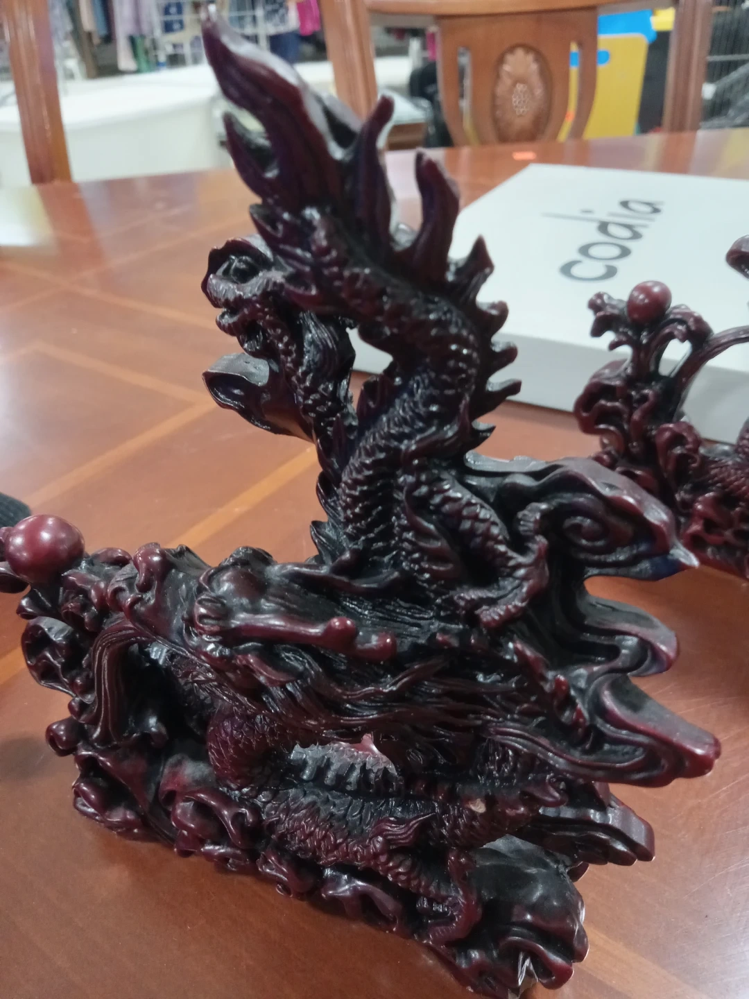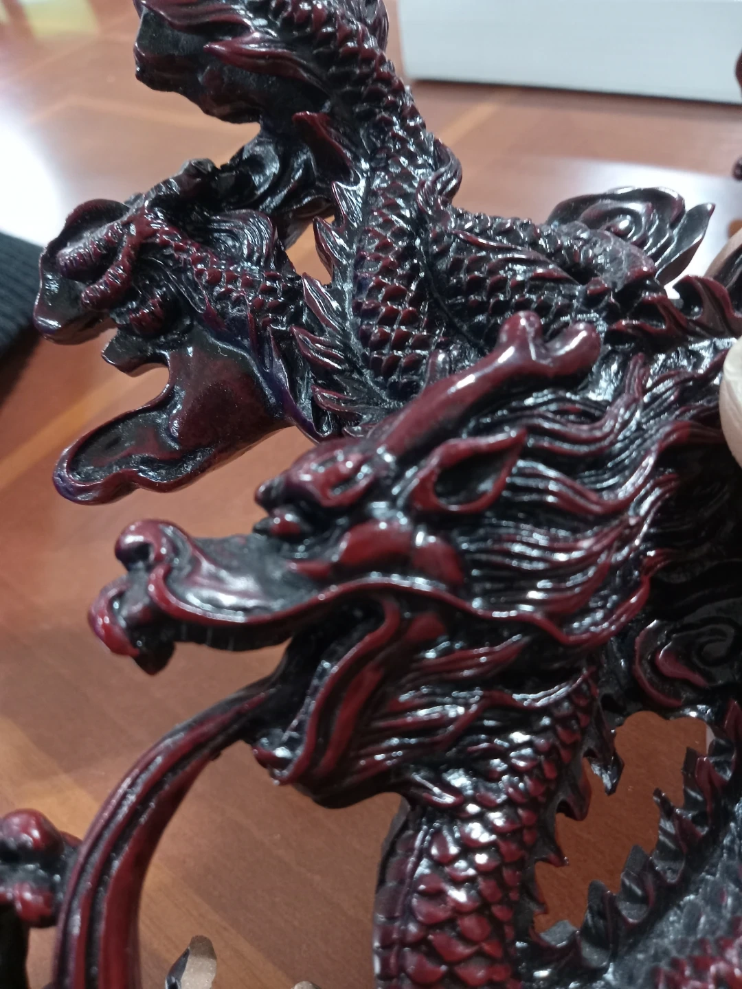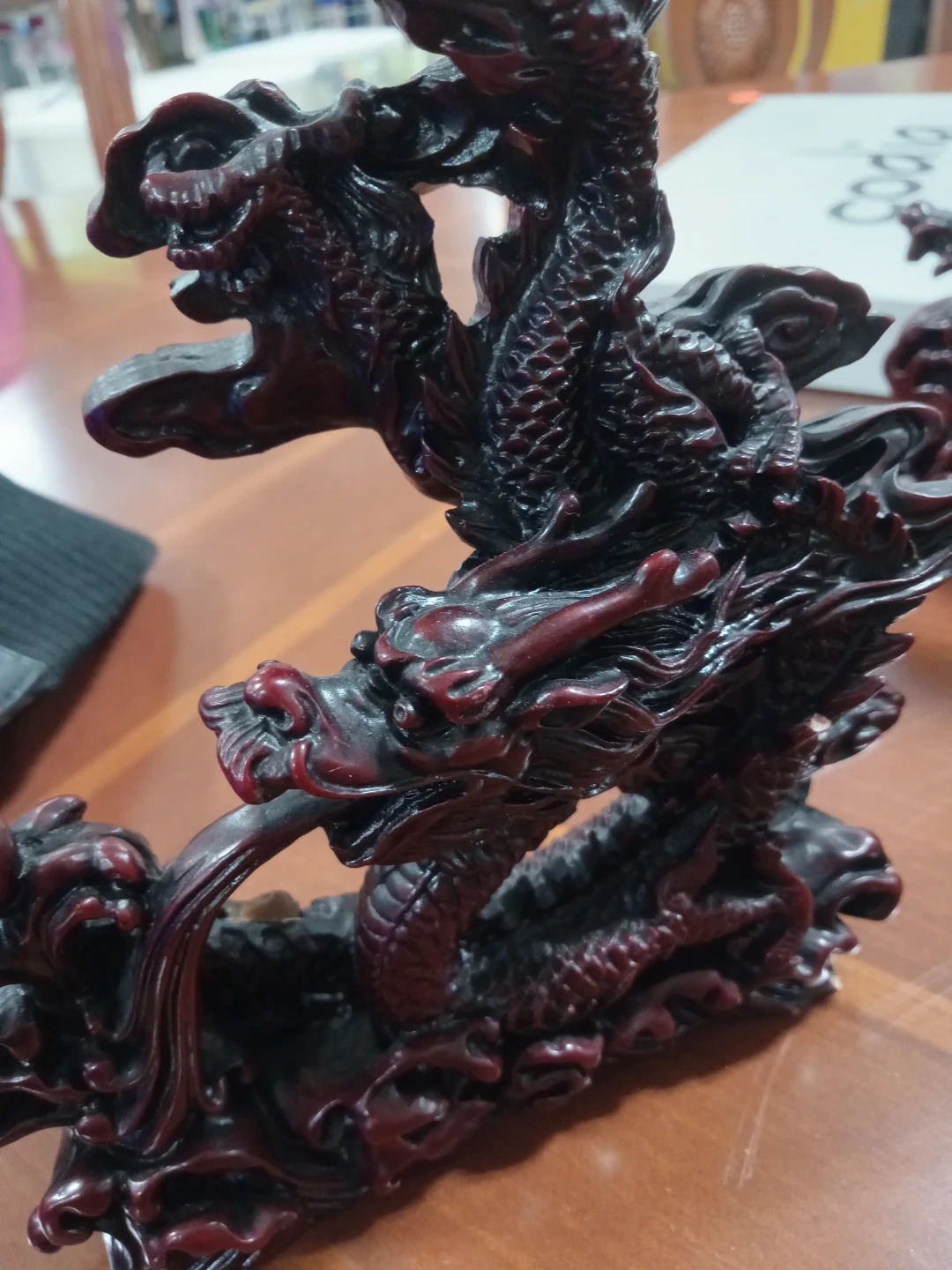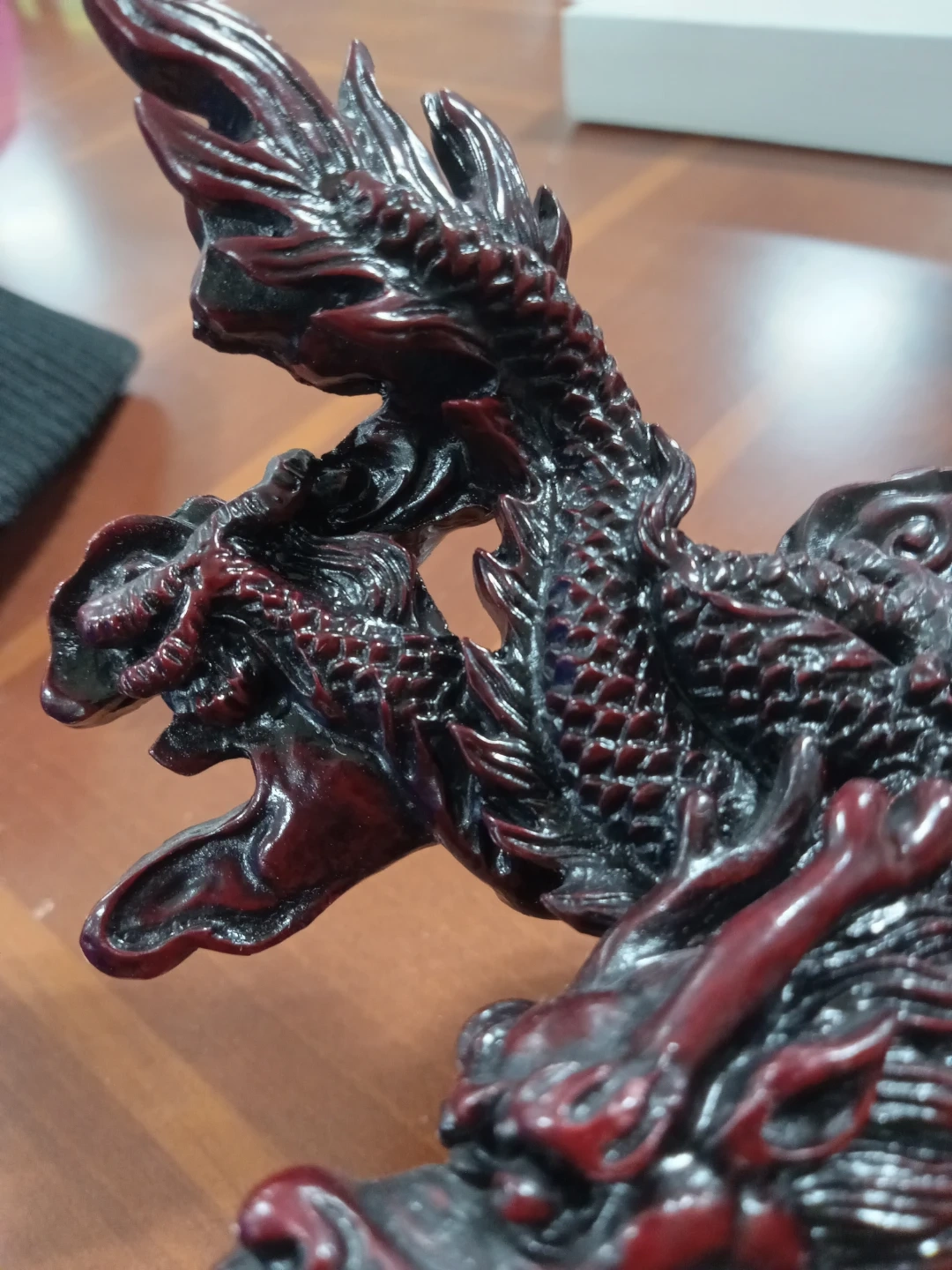 Here's a beautiful dragon figurine in a striking red and black colour scheme! It would make a great addition to any collection or as a unique decorative piece for your home