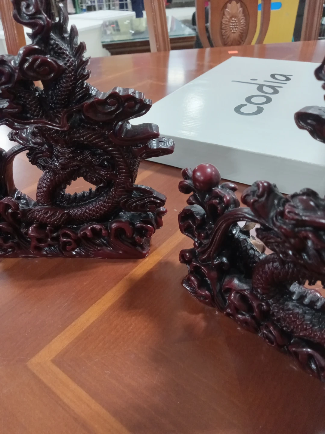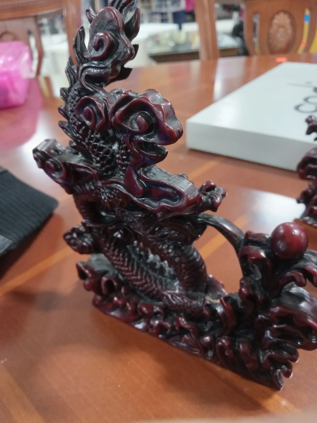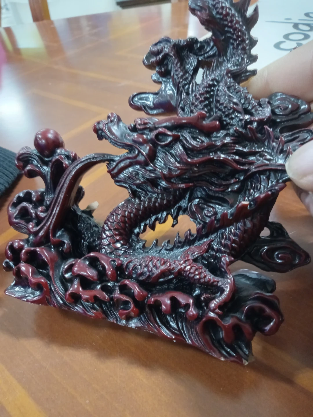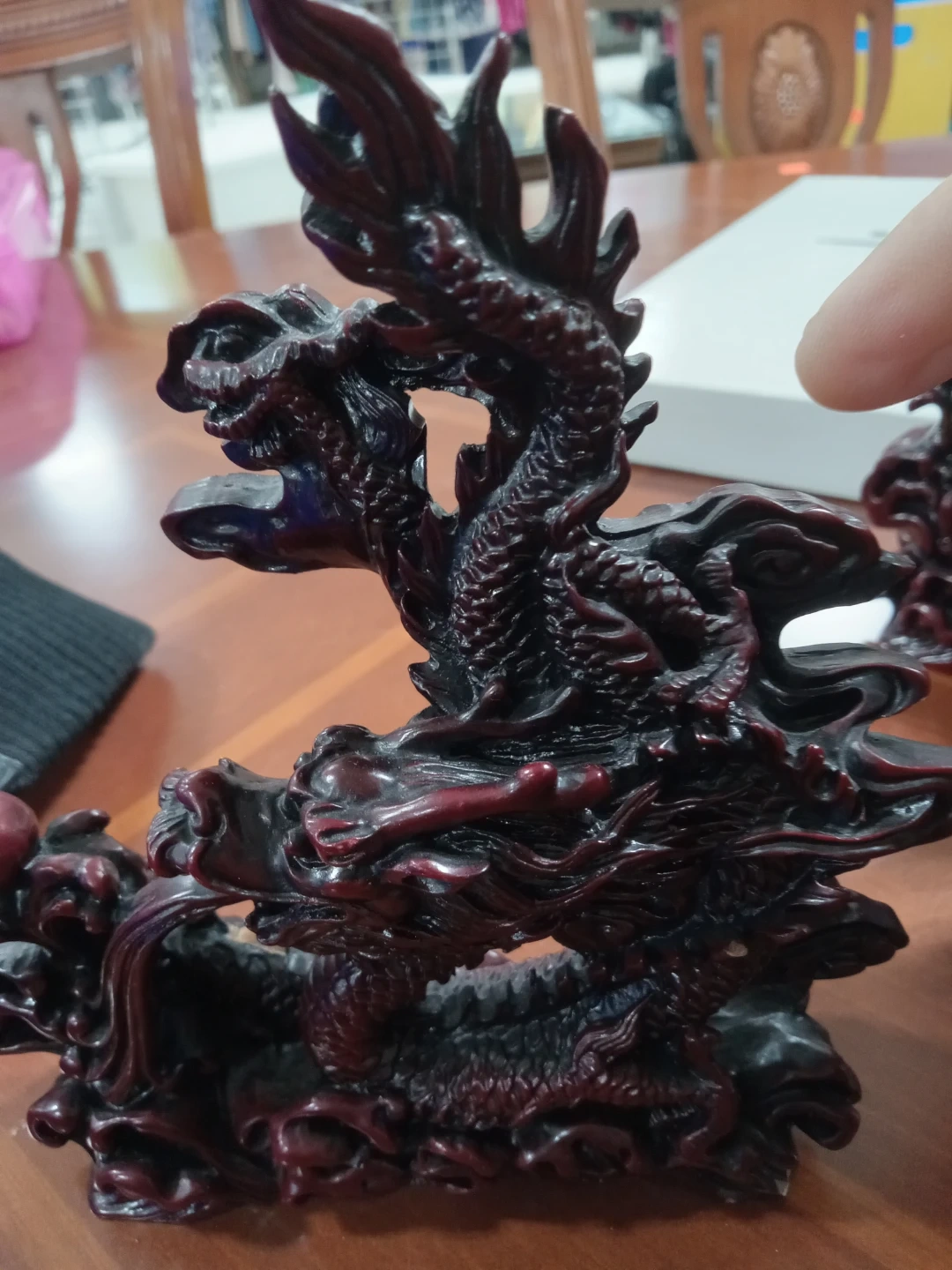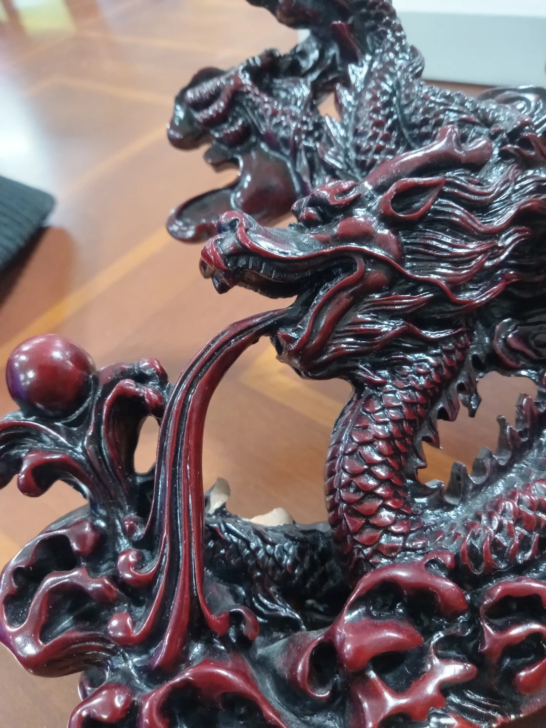 Here's a beautiful dragon figurine in a striking red and black colour scheme! It would make a great addition to any collection or as a unique decorative piece for your home