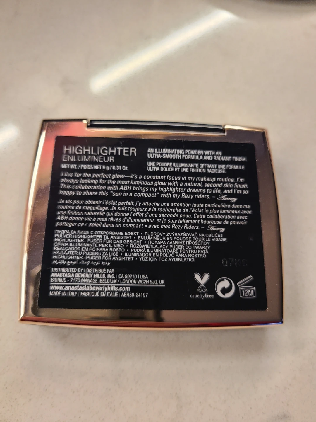 Anastasia Beverly Hills Amrezy highlighter! It's a beautiful illuminating powder with an ultra-smooth formula for a radiant finish. Net weight is 9 g / 0.31 oz