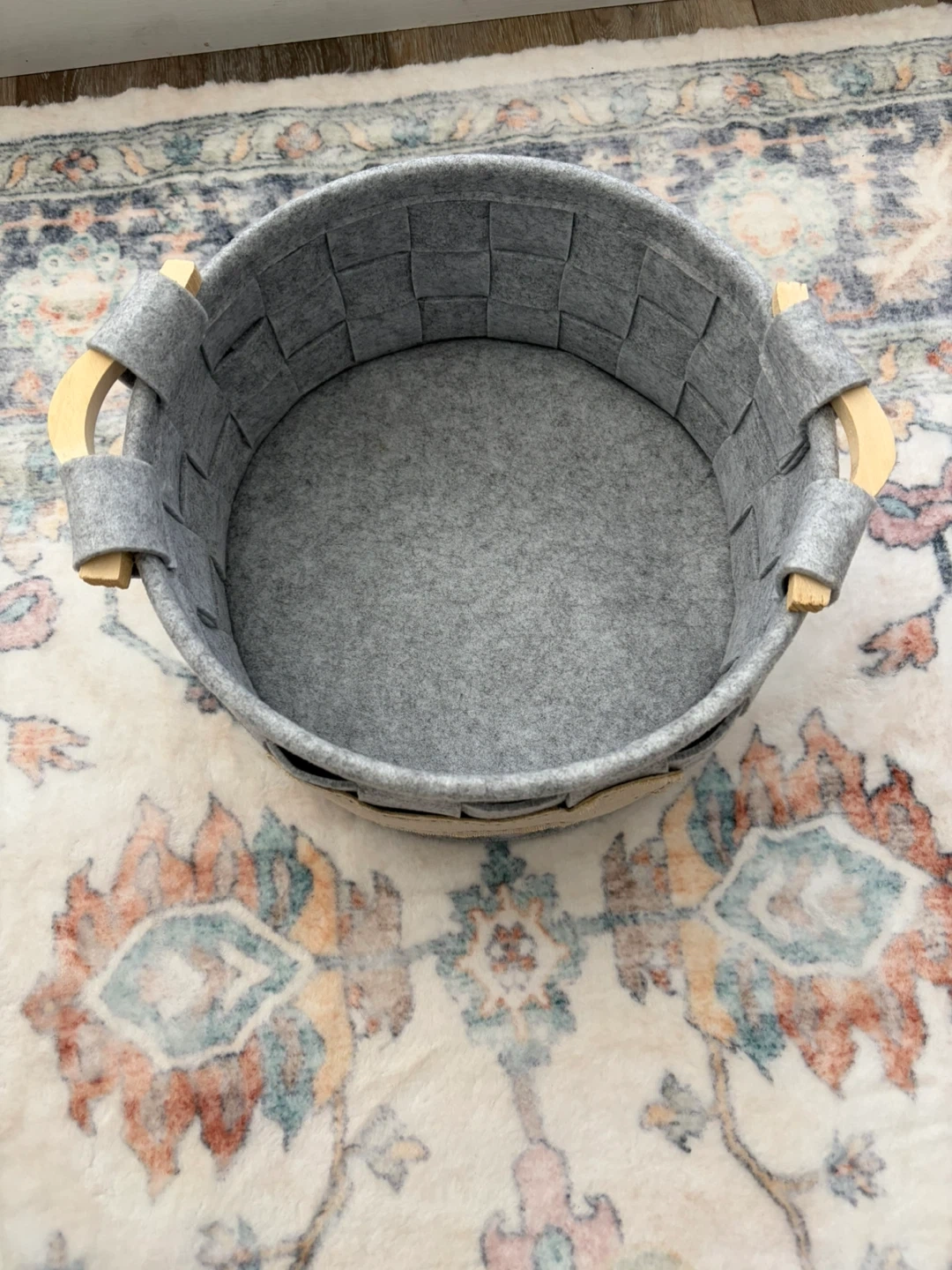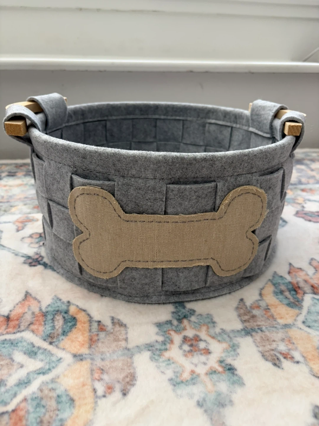Selling a cute grey dog toy basket! It's perfect for keeping your furry friend's toys or treats organized. The basket features a woven design and a bone-shaped patch on the front. It has wooden handles.