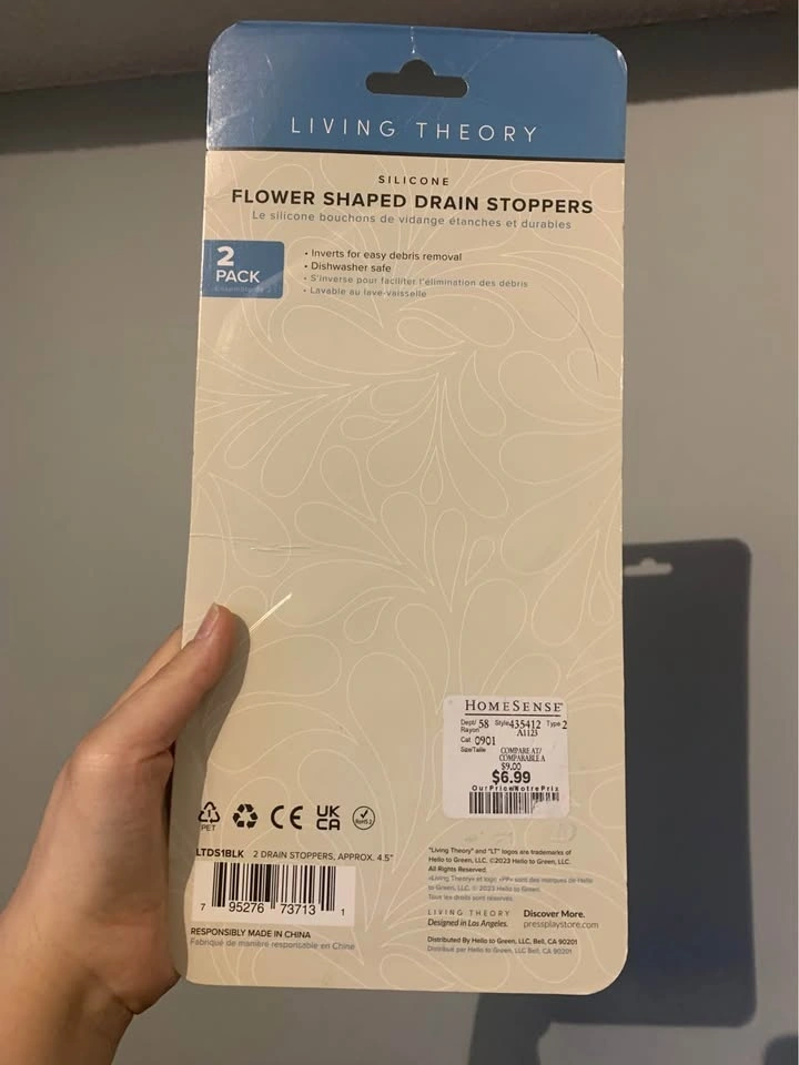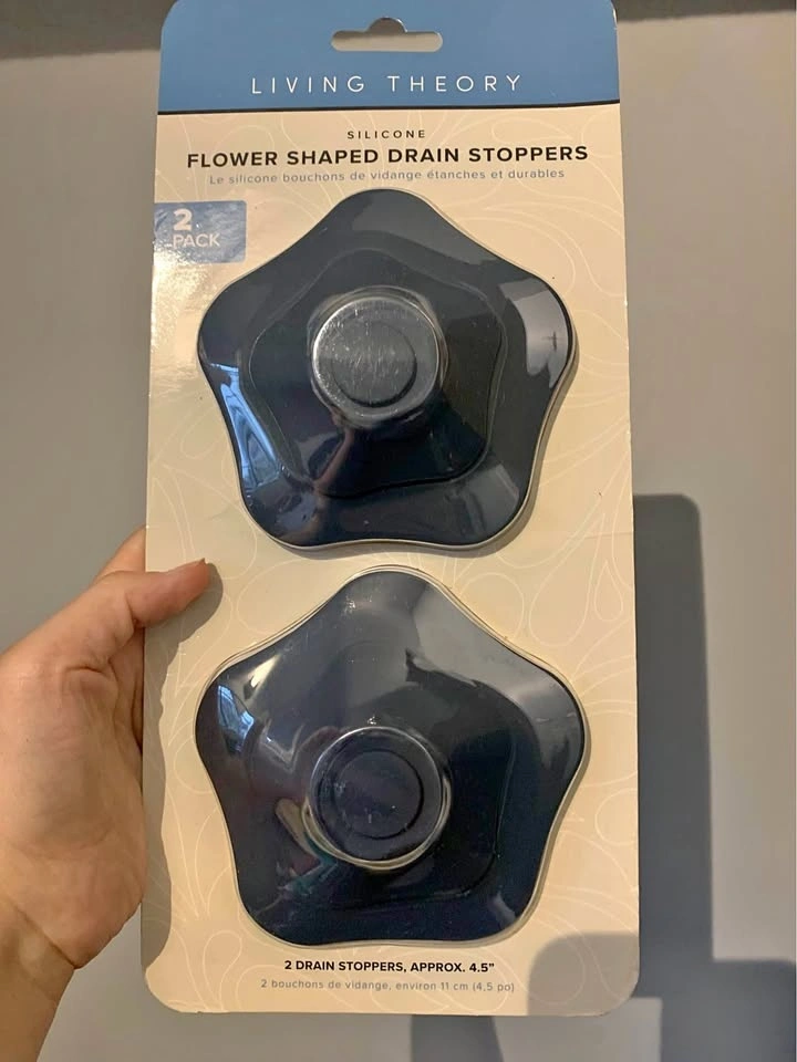 Brand new, still in original packaging. Silicone flower-shaped drain stoppers, 2-pack, approx. 4.5 inches. Dishwasher safe and easy to remove debris when inverted.