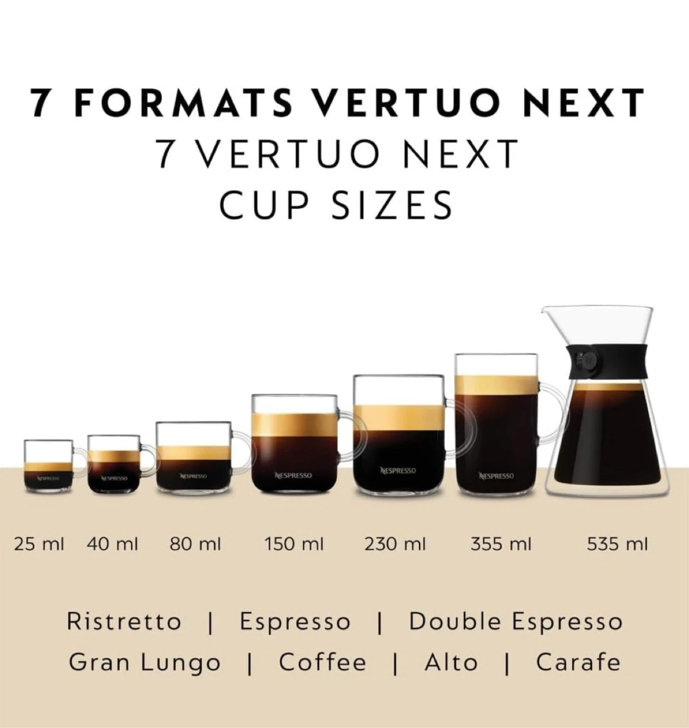 - Versatile machine offering 7 coffee sizes (Ristretto, Espresso, Double Espresso, Gran Lungo, Mug/Coffee, Alto&Cold Brew Style, and Carafe)