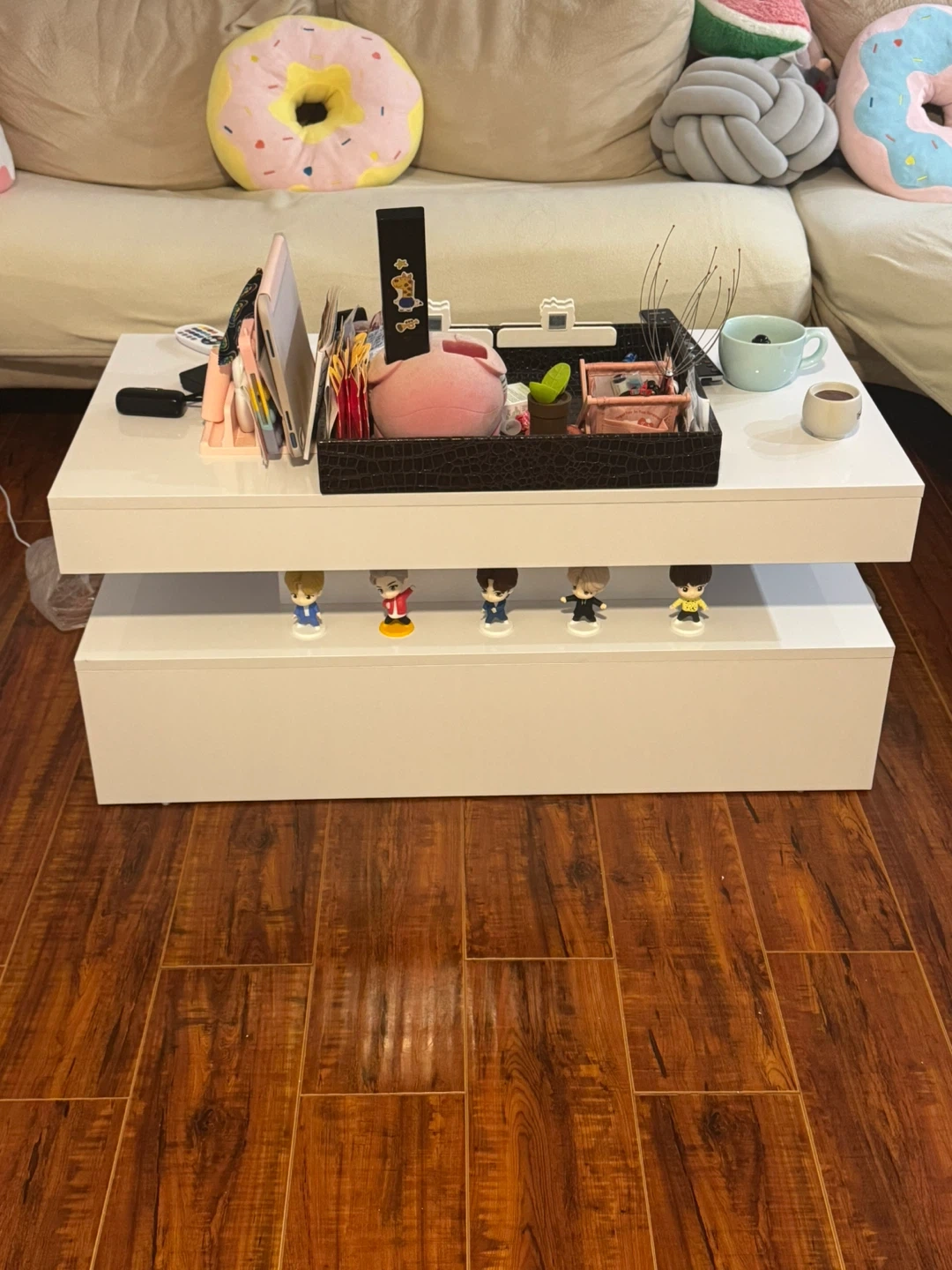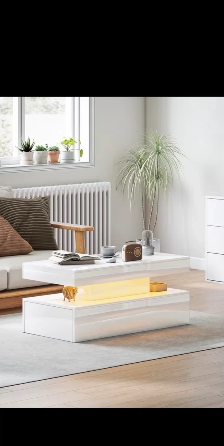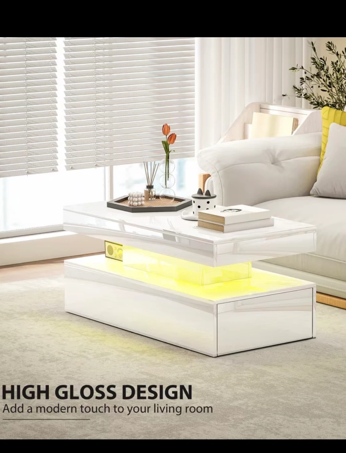 This modern coffee table features a high gloss design with RGB LED lights and a remote control. It has both open shelves and two drawers to keep your living room tidy. The table is white and measures approximately 37.4" x 18.9" x 16.5". It offers open and hidden storage for easy access to daily items and keeps clutter out of sight
