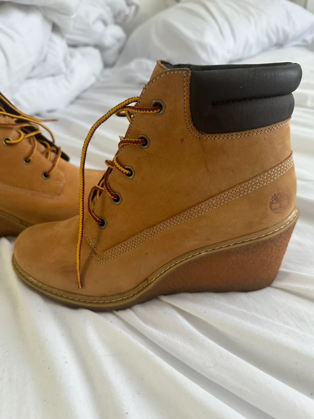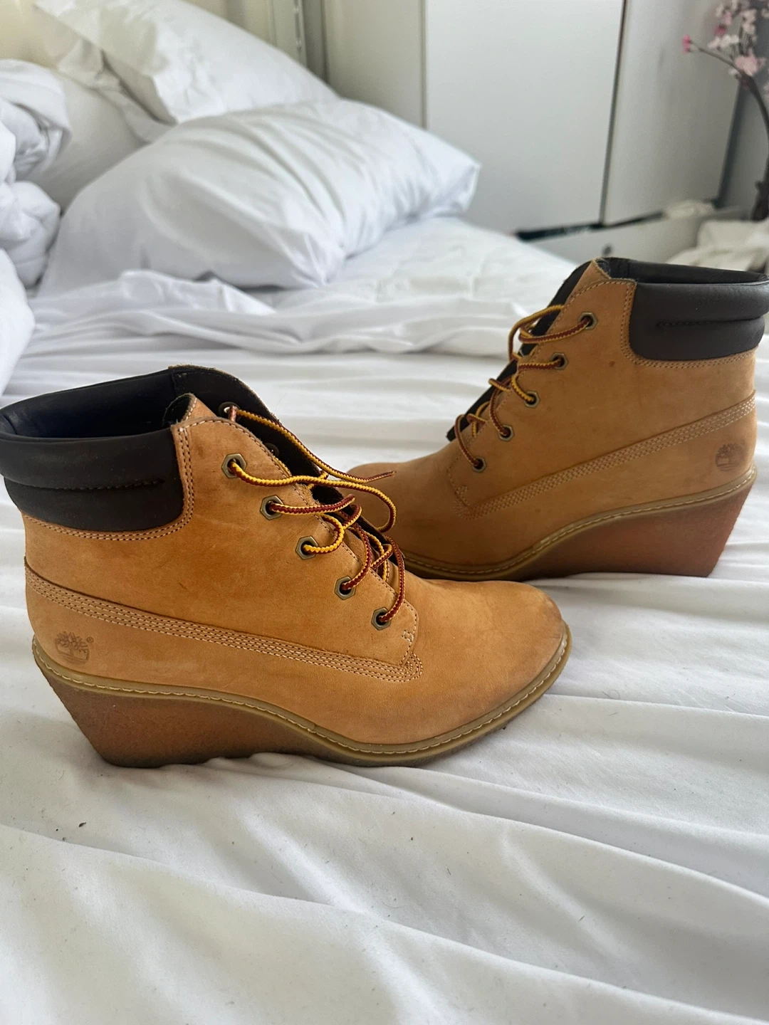 Get ready to step out in style with these Timberland wedge heel ankle boots! These boots feature a classic tan color and the iconic Timberland logo. They're perfect for adding a little height and a lot of style to any outfit
