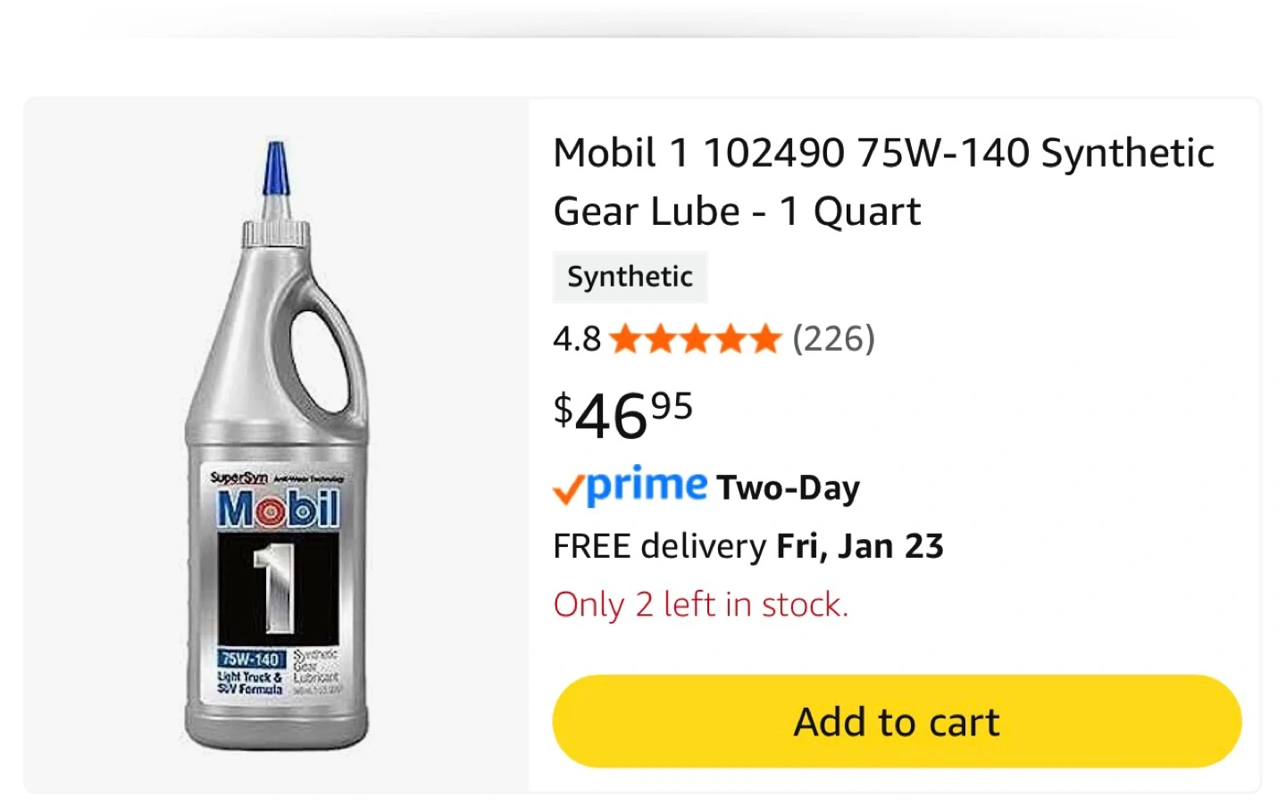 Selling a 1 quart bottle of Mobil 1 75W-140 synthetic gear lube. It's designed for light trucks and SUVs. Retails for $46.95 plus tax. Have extra 2 sealed for only $25 each my loss your gain. Mechanic shop told me bought to many