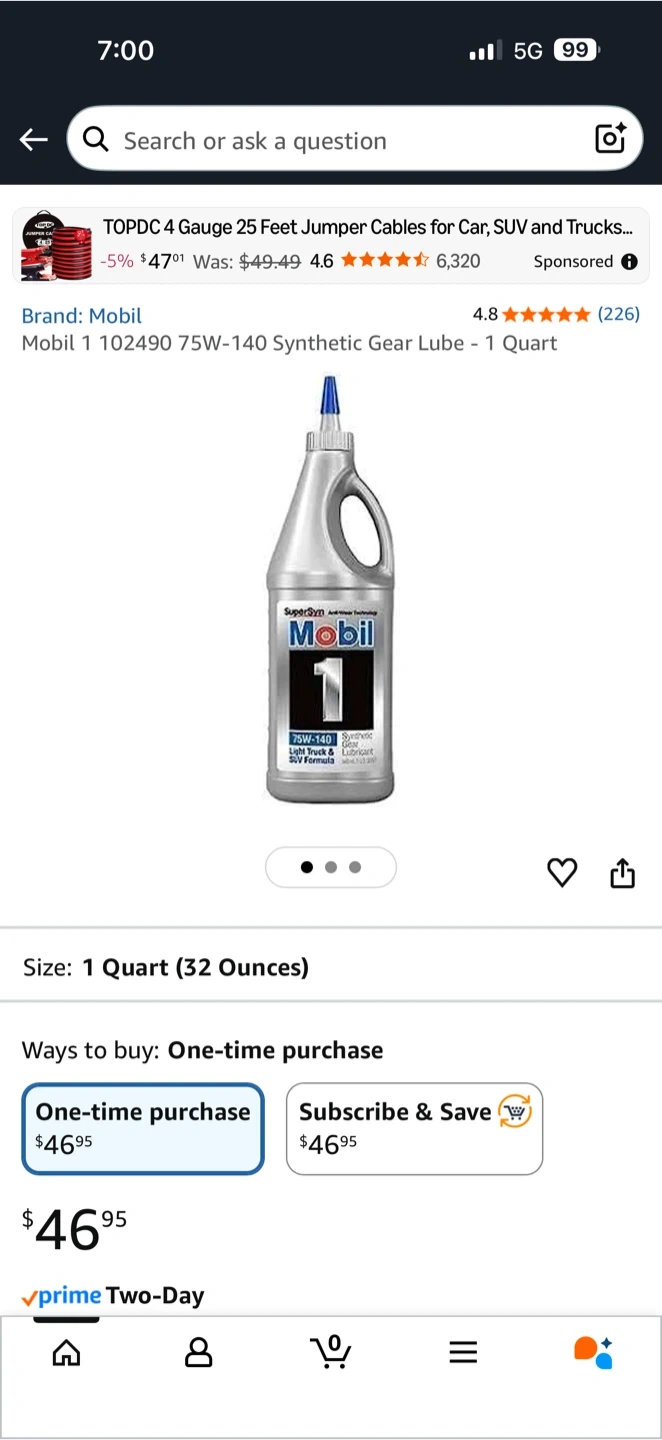 Selling a 1 quart bottle of Mobil 1 75W-140 synthetic gear lube. It's designed for light trucks and SUVs. Retails for $46.95 plus tax. Have extra 2 sealed for only $25 each my loss your gain. Mechanic shop told me bought to many