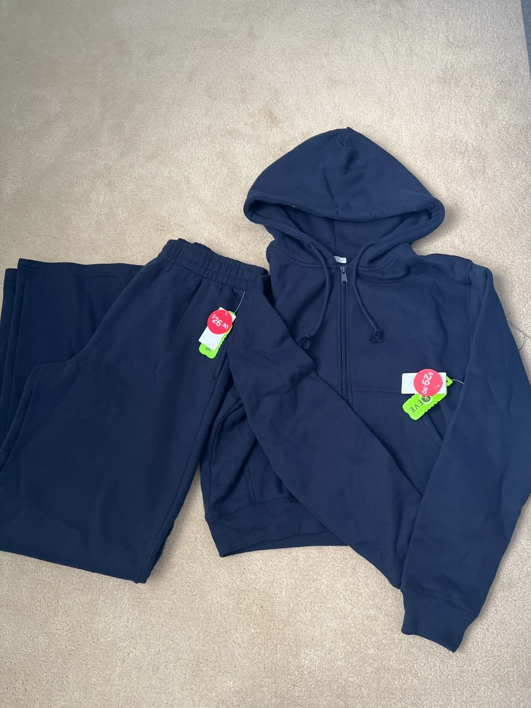 Selling a brand new Ardene tracksuit in a lovely navy blue colour! The set includes a zip-up hoodie (size M) and comfy sweatpants (size L). Both pieces still have their original tags attached. Originally bought for $29.90 (hoodie) and $26.90 (pants). Both are the same colour concord blue.