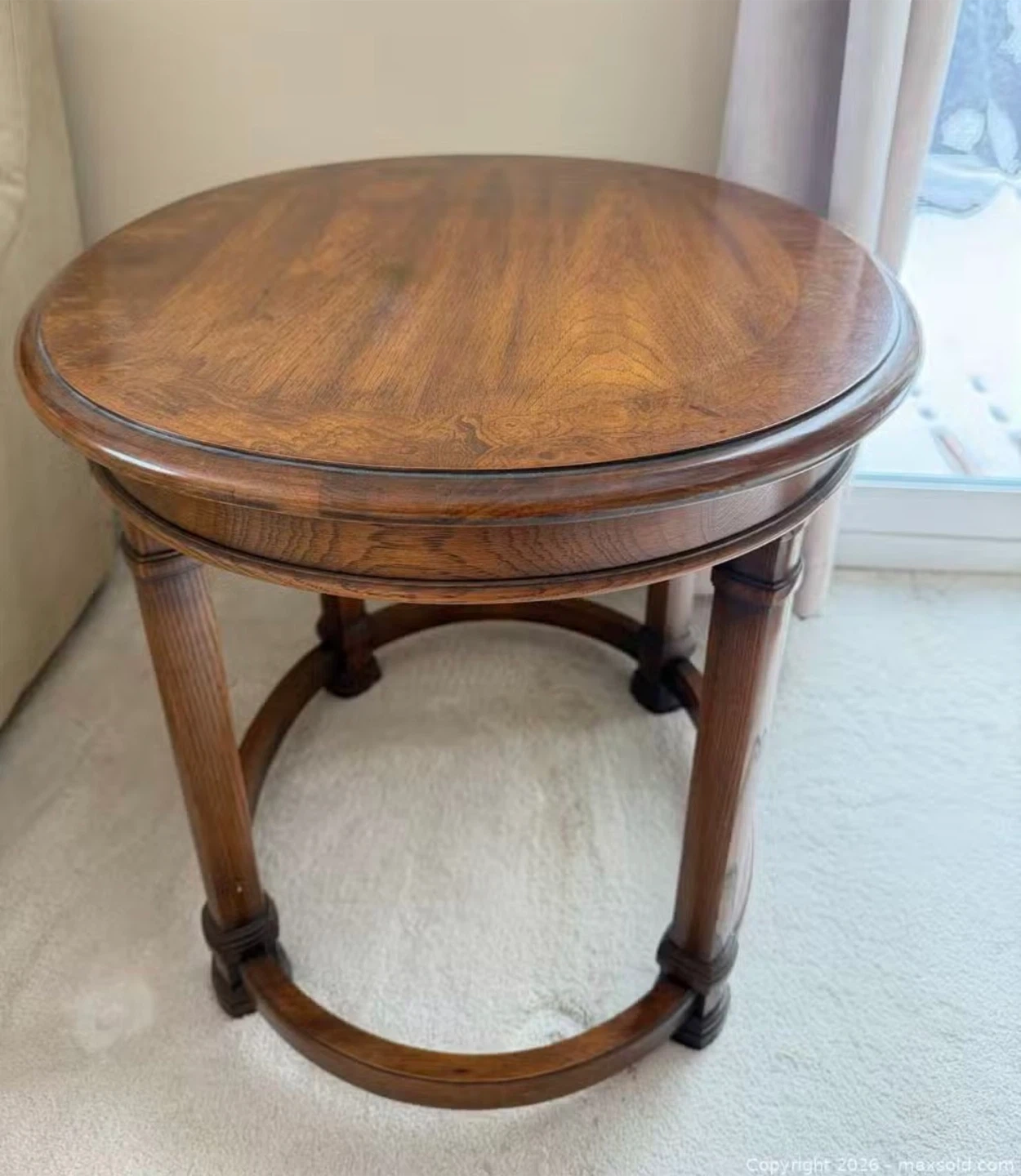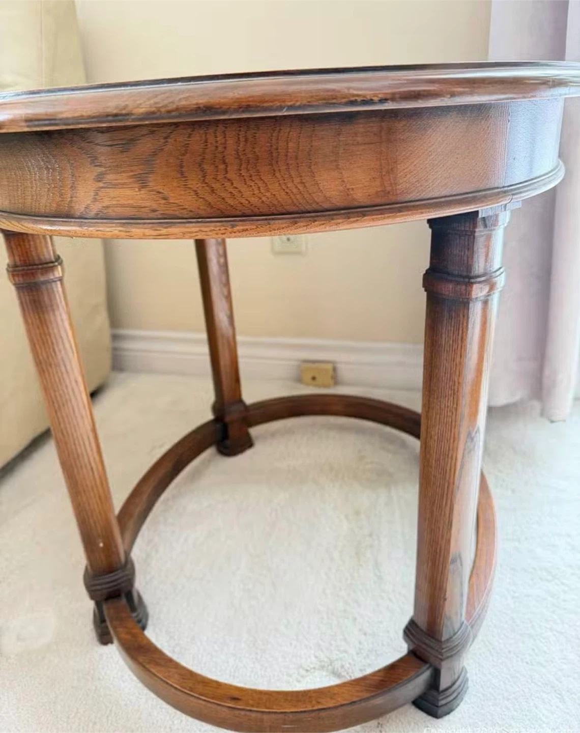 Selling a lovely round wooden accent table! It's in great condition and would look perfect in any living room or bedroom. The wood has a beautiful warm tone that adds a touch of elegance to your space