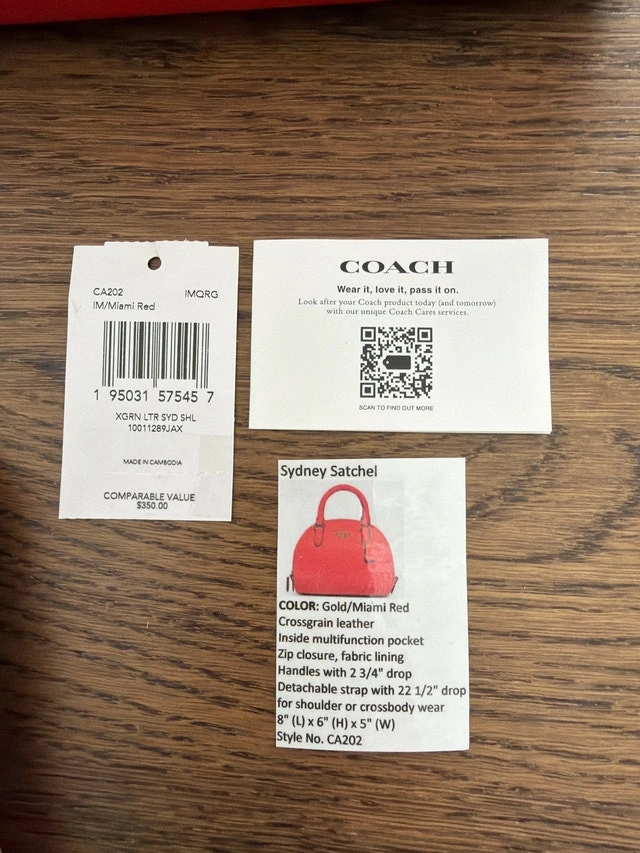 I'm selling a Coach Sydney Satchel in mustard yellow, crafted from crossgrain leather. This satchel includes an inside multifunction pocket and a detachable strap for versatile wear. Colour: Miami Read. Material: Crossgrain leather. Closure: Zip. Lining: Fabric. Handles: 2 3/4" drop. Strap: Detachable with 22 1/2" drop. Dimensions: 8" (L) x 6" (H) x 5" (W). Style No.: CA202. Condition: New. Payment accepted: Cash, Cashless.