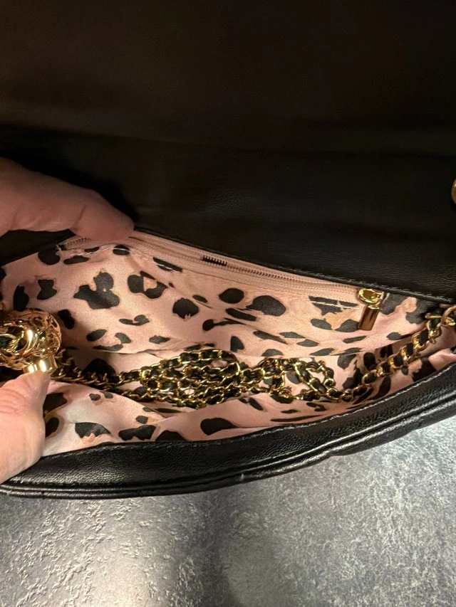 This is a black quilted bag with gold hardware and a unique spherical detail on the chain. The interior features a fun leopard print lining, adding a touch of whimsy to the classic design. Never Used.