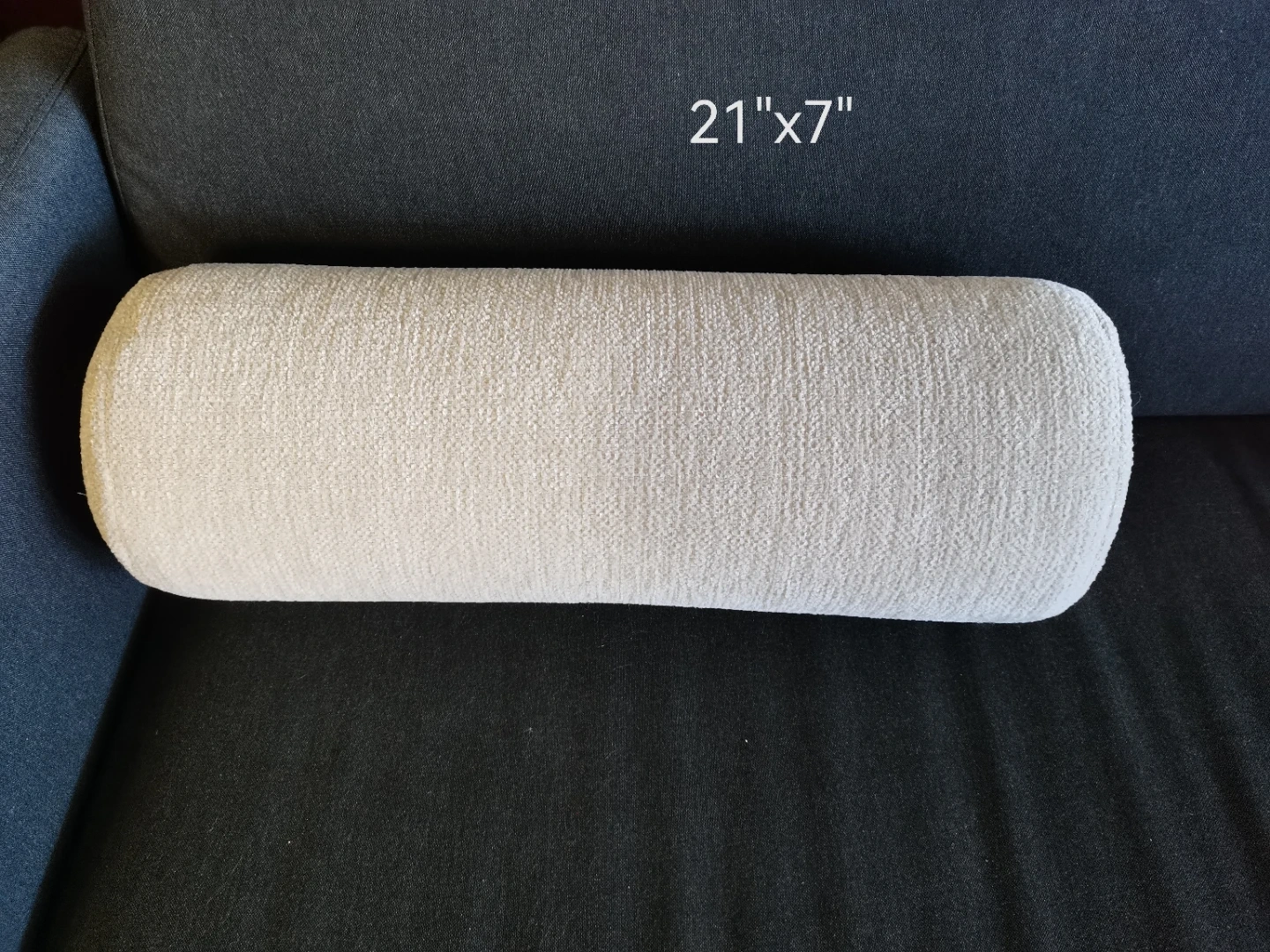 This bolster pillow, measuring 21" x 7", is in used condition and ready to add some extra comfort and style to your home decor! It has a neutral colour that complements any space.