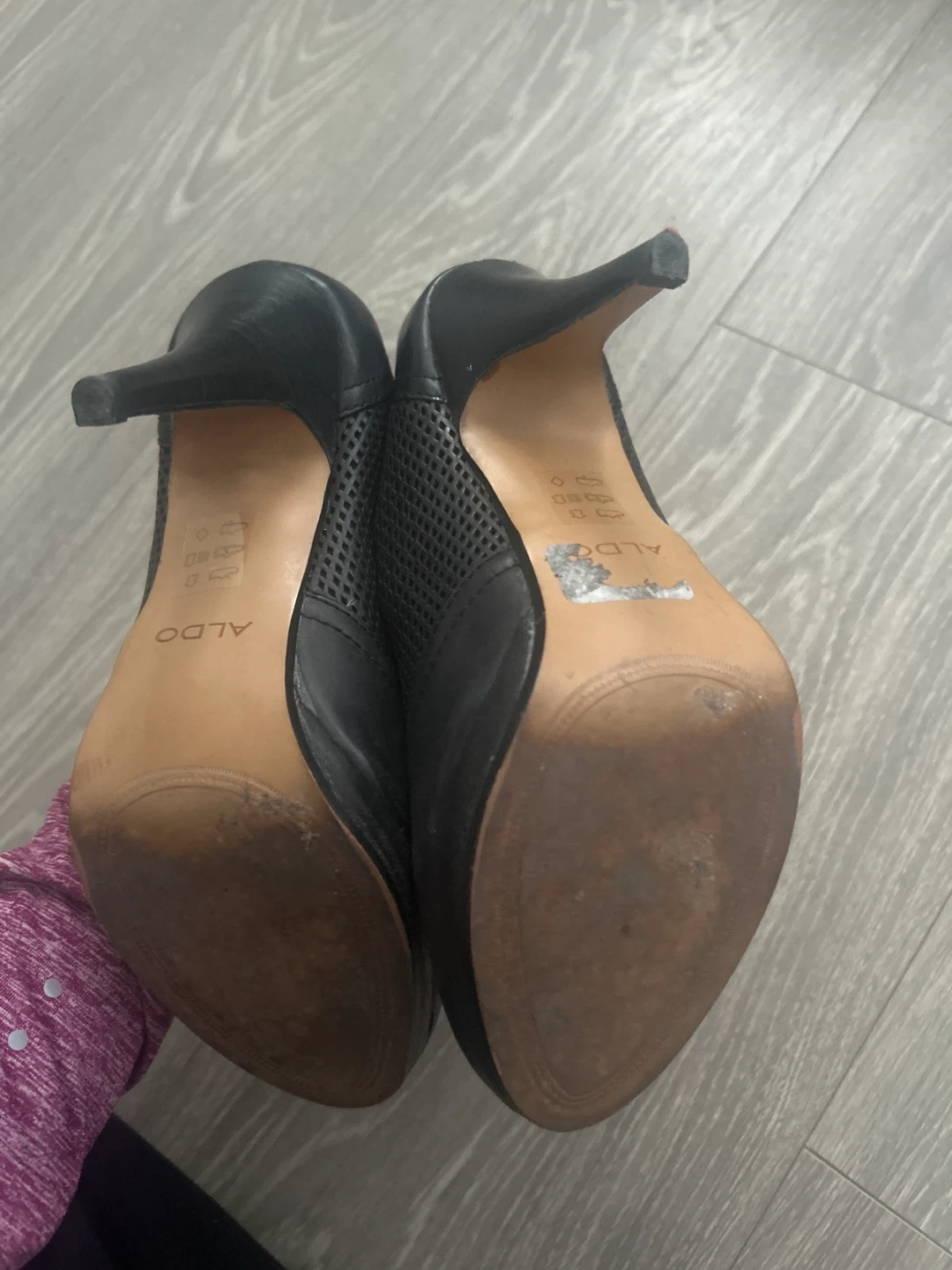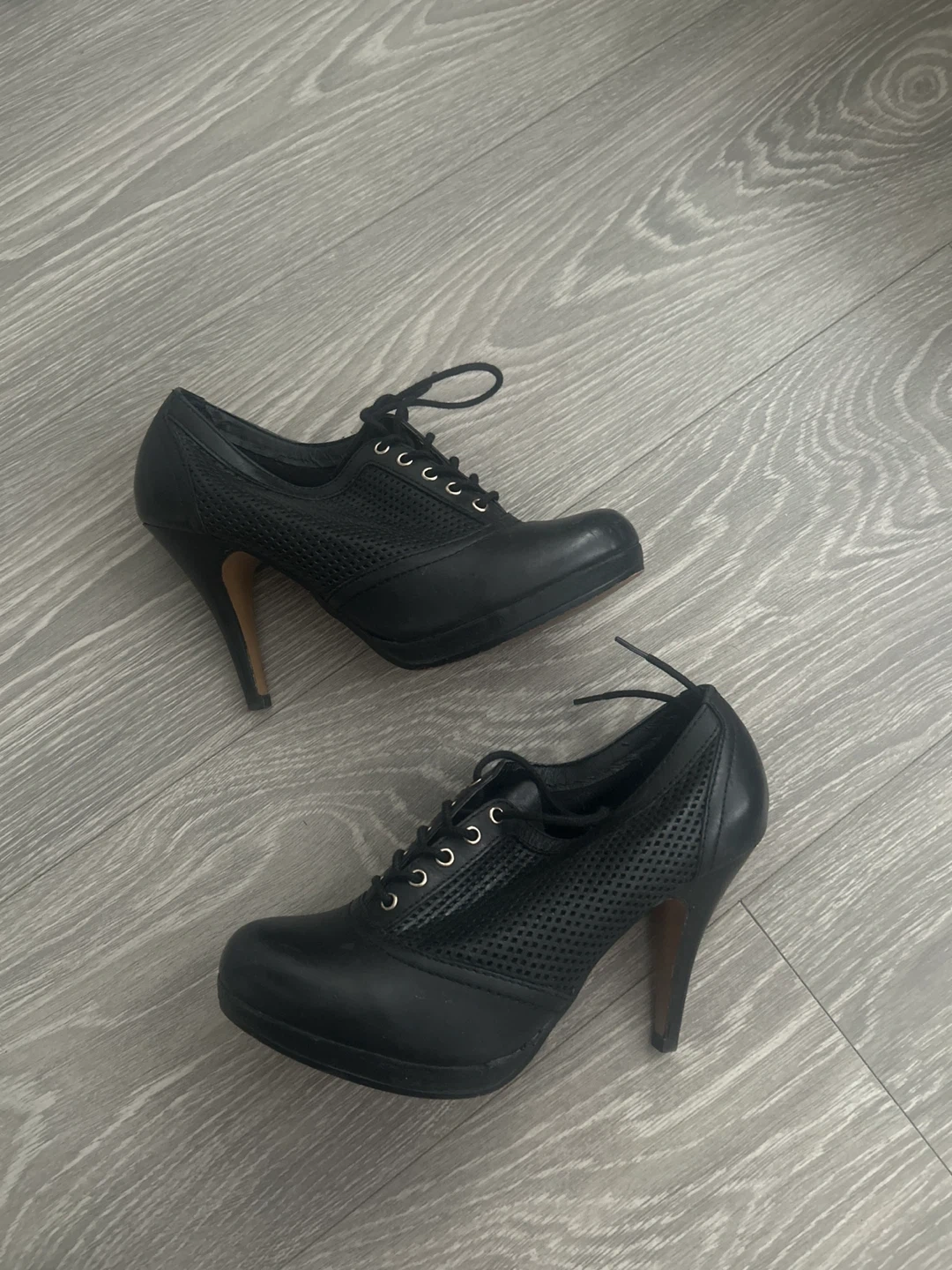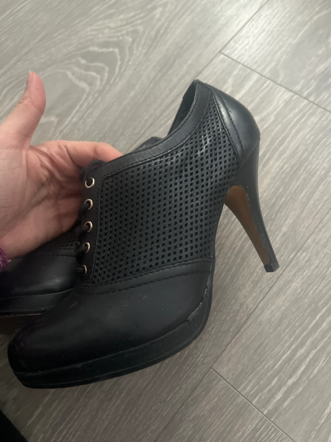 Selling a pair of Aldo heeled booties in black. They are a size 8 and have a lace-up front. There are some signs of wear on the soles, but they're still in good condition for daily wear!
